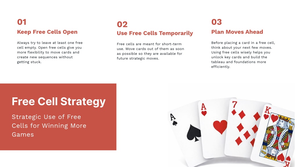 6. 01 03 02 Keep Free Cells Open Plan Moves Ahead Use Free Cells Temporarily Always try to leave at least one free cell empty. Open free cells give you more flexibility to move cards and create new sequences without getting stuck. Before placing a card in a free cell, think about your next few moves. Using free cells wisely helps you unlock key cards and build the tableau and foundations more efficiently. Free cells are meant for short-term use. Move cards out of them as soon as possible so they are available for future strategic moves. Free Cell Strategy Strategic Use of Free Cells for Winning More Games