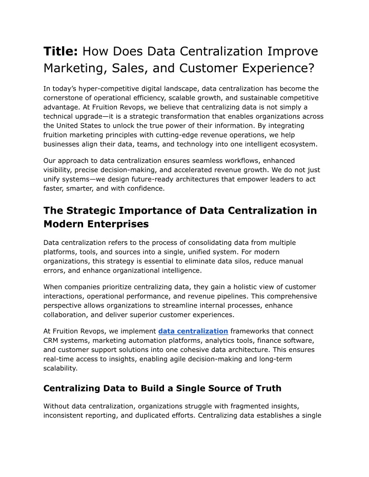 systems. This alignment empowers organizations to track performance across channels, measure ROI accurately, and optimize strategies continuously. By centralizing data, we ensure that marketing investments generate measurable business outcomes. Our frameworks enable brands to deliver consistent messaging, personalized engagement, and seamless omnichannel experiences. Advanced Data Architecture for Scalable Business Growth At Fruition Revops, we design advanced data architectures that prioritize flexibility, security, and scalability. Our data centralization strategies are built to support business expansion, market diversification, and evolving customer expectations. We implement: ● Cloud-based centralized data platforms ● Secure data pipelines and integrations ● Automated reporting dashboards ● Real-time analytics systems ● AI-driven predictive insights By centralizing data, organizations gain enterprise-grade visibility that supports both strategic planning and operational execution. Our solutions ensure that data flows seamlessly across systems, enabling innovation without complexity. Centralizing Data to Optimize Customer Experience Customer experience has become the ultimate differentiator. Data centralization allows organizations to deliver consistent, personalized, and frictionless interactions across every touchpoint. By centralizing data, we provide a complete view of customer behavior, preferences, and engagement history. This enables personalized messaging, proactive support, and predictive engagement strategies. Through fruition marketing, we transform centralized data into meaningful experiences that increase trust, loyalty, and brand advocacy. Our solutions empower organizations to anticipate customer needs, respond instantly, and exceed expectations at every stage of the journey. Compliance, Security, and Governance Through Data Centralization
