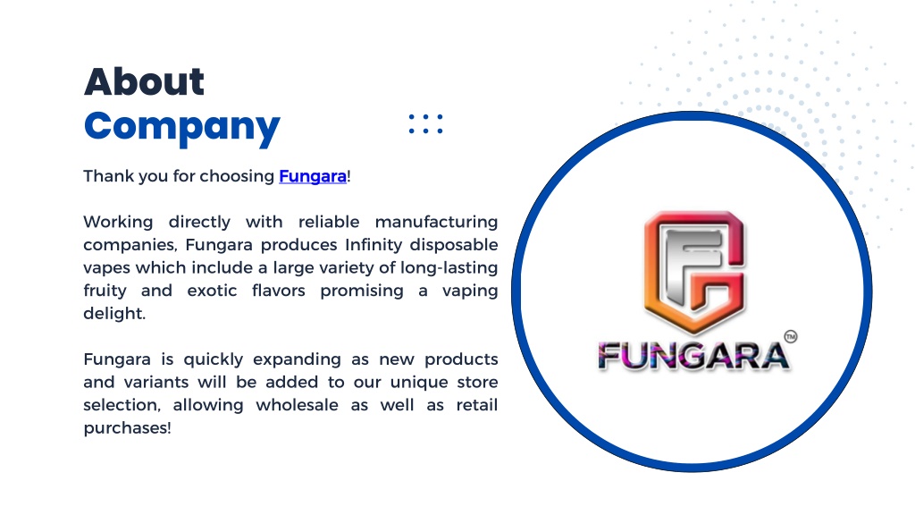 About Company Thank you for choosing Fungara! Working directly with reliable manufacturing companies, Fungara produces Infinity disposable vapes which include a large variety of long-lasting fruity and exotic flavors promising a vaping delight. Fungara is quickly expanding as new products and variants will be added to our unique store selection, allowing wholesale as well as retail purchases!