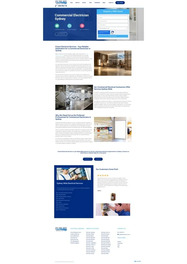 Home About Us Services FAQs Testimonials Blogs Contact Us Free Quote 1300 998 718 Request a FREE Quote Commercial Electrician Sydney Name* Contact Number* Email Address* I need assistance with... Competitively Priced 24 Hour Emergency Free Quote Request protected by reCAPTCHA Privacy - Terms View Our Services Request Quote Future Electrical Services - Your Reliable Destination for a Commercial Electrician in Sydney When it comes to 24-hour emergency repairs and trusted service, Future Electrical Services stands out as your preferred destination for a reliable commercial electrician in Sydney. As a locally owned and operated family business, we prioritise building strong trust with our customers. Whether it’s day or night, our trained professionals are always ready to provide prompt and e?cient electrical solutions. At Future Electrical Services, no job is too big or too small. We understand the importance of every task and are committed to delivering quality results. From repairs to maintenance and improvements, our experienced electricians offer a one-stop shop for all your electrical needs. We take pride in our professionalism, ensuring that every project is completed with precision and preventing potential issues down the line. We offer ?rst-time customers a free call-out, allowing you to experience our exceptional service ?rsthand. Additionally, our friendly team is ready to provide a free quote when you inquire about our solutions. Trust Future Electrical Services for unparalleled service that prioritises your electrical needs. Our Commercial Electrical Contractors Offer Services Sydney-Wide Our team of commercial electrical contractors at Future Electrical Services provides a comprehensive range of services throughout Sydney. Specialising in various areas, we cover commercial electrical services, repairs, domestic electrical services, fault ?nding, electricity for renovations, lighting, electrical installations, power points, electrical maintenance, and air conditioning. No matter the complexity of the task, if it involves electrical components, we have the expertise to assist you. Future Electrical Services takes pride in being a reliable and e?cient solution for all your electrical requirements. Our commercial electrical contractors are trained to handle diverse projects, ensuring that each one is completed with precision and quality. Why We Stand Out as the Preferred Professional for Commercial Electricians in Sydney Choosing Future Electrical Services as your commercial electrical contractor in Sydney ensures you bene?t from a reliable and experienced team. With over 10 years of industry experience, our professionals are well-equipped to handle a wide range of electrical services for commercial, retail, and industrial properties. We are committed to delivering excellence, offering 24/7 emergency service and comprehensive electrical solutions. All our electricians are fully licensed and strictly comply with Workplace Health and Safety Standards. At Future Electrical Services, our friendly electricians work closely with you to provide the best possible solution for your property. Our services are competitively priced, and we offer free quotes, making it easier for you to make informed decisions about your electrical needs. Trust Future Electrical Services for unmatched reliability, expertise, and commitment to quality in commercial electrical solutions in Sydney. Future Electrical Services is your dependable partner for all your commercial electrical requirements in Sydney. Contact our electricians in Sydney today for a free quote. 1300 998 718 Contact Us Our Customers Come First! “ We used future electric services to install our downlights for three different rooms. We were very impressed with the standard of the work and how quick the job was completed! The advice and explanation of alternative methods to complete the job, allowed us to save money and have the lights arranged better than we planned. I highly recommend future electric services to people who are looking for reasonable pricing and fast services!” Sydney Wide Electrical Services If it involves electrical items, the chances are we can help! We specialise in a wide range of services, including: Joelle K. Commercial electrical services Electrical repairs Domestic electrical services Fault ?nding Electricity for renovations Lights Electrical installations Power points Electrical maintenance Air conditioning ELECTRICAL SERVICES SERVICE LOCATIONS CONTACT US 24 Hour Emergency Service Electricians Alexandria Electricians Lane Cove 1300 998 718 Commercial Electrician Electricians Ash?eld Electricians Liverpool info@futureelectrics.com.au Electrical Maintenance Electricians Balmain Electricians Manly QUICK LINKS General Electrical Electricians Bankstown Electricians Maroubra Industrial Electrician Electricians Blacktown Electricians Newtown LED Lighting Upgrades Electricians Bondi Electricians North Ryde About Us Switchboard Upgrades Electricians Campbelltown Electricians North Shore Testimonials Electricians Chatswood Electricians North Sydney FAQs Electricians Coogee Electricians Parramatta Blog Electricians Cronulla Electricians Ryde Electricians Drummoyne Electricians Strath?eld Electricians Gladesville Electricians Surry Hills Electricians Hornsby Electricians Sydney Live Chat © 2021 Future Electric Services | ABN: 15 614 262 976