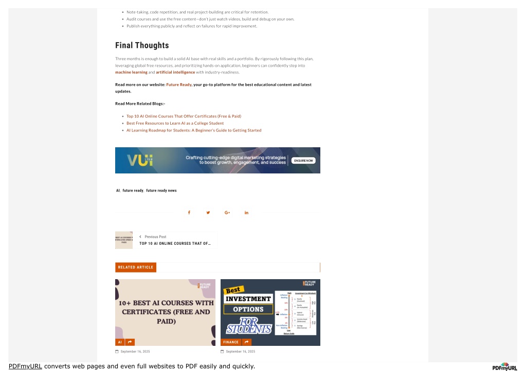 Note-taking, code repetition, and real project-building are critical for retention. Audit courses and use the free content—don’t just watch videos, build and debug on your own. Publish everything publicly and reflect on failures for rapid improvement. Final Thoughts Three months is enough to build a solid AI base with real skills and a portfolio. By rigorously following this plan, leveraging global free resources, and prioritizing hands-on application, beginners can confidently step into machine learning and artificial intelligence with industry-readiness. Read more on our website: Future Ready, your go-to platform for the best educational content and latest updates. Read More Related Blogs:- Top 10 AI Online Courses That Offer Certificates (Free & Paid) Best Free Resources to Learn AI as a College Student AI Learning Roadmap for Students: A Beginner’s Guide to Getting Started AI, future ready, future ready news Previous Post TOP 10 AI ONLINE COURSES THAT OF… RELATED ARTICLE AI FINANCE September 16, 2025 September 16, 2025 PDFmyURL converts web pages and even full websites to PDF easily and quickly.