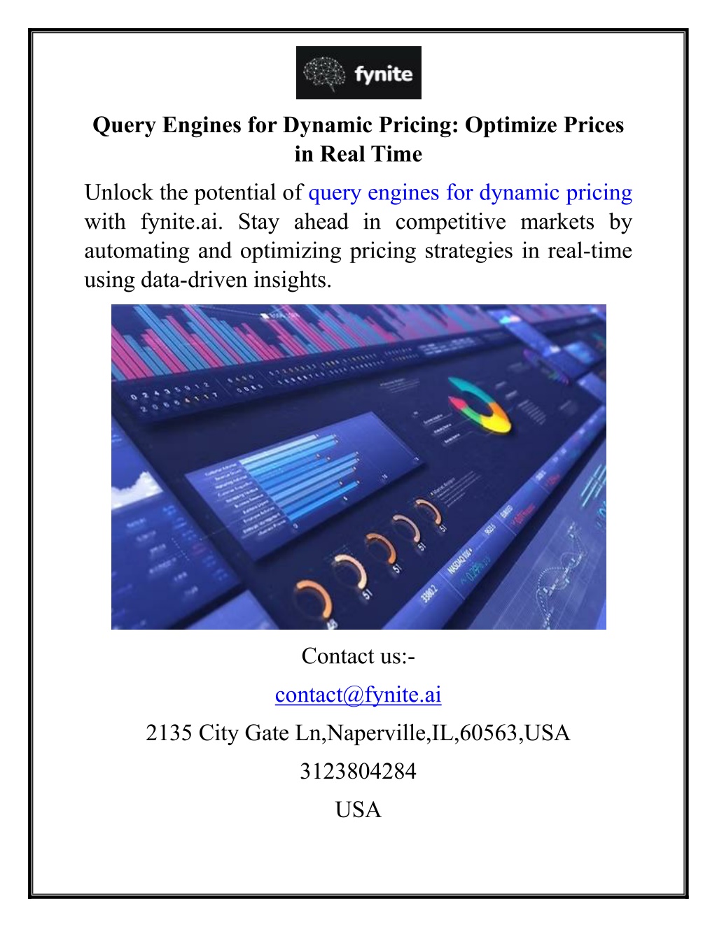 Query Engines for Dynamic Pricing: Optimize Prices in Real Time Unlock the potential of query engines for dynamic pricing with fynite.ai. Stay ahead in competitive markets by automating and optimizing pricing strategies in real-time using data-driven insights. Contact us:- contact@fynite.ai 2135 City Gate Ln,Naperville,IL,60563,USA 3123804284 USA