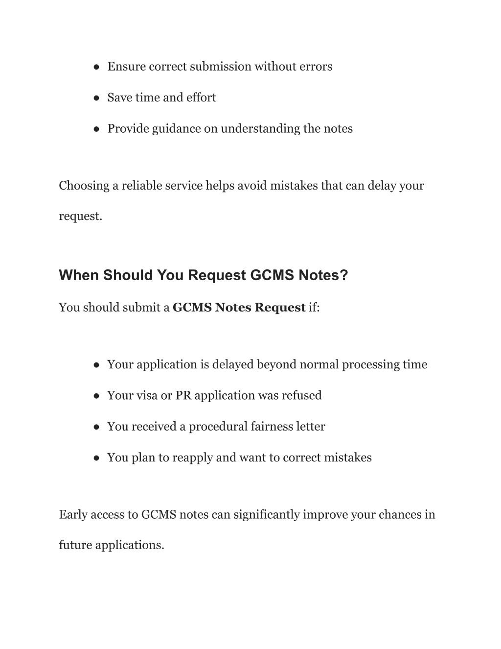 ● Ensure correct submission without errors ● Save time and effort ● Provide guidance on understanding the notes Choosing a reliable service helps avoid mistakes that can delay your request. When Should You Request GCMS Notes? You should submit a GCMS Notes Request if: ● Your application is delayed beyond normal processing time ● Your visa or PR application was refused ● You received a procedural fairness letter ● You plan to reapply and want to correct mistakes Early access to GCMS notes can significantly improve your chances in future applications.