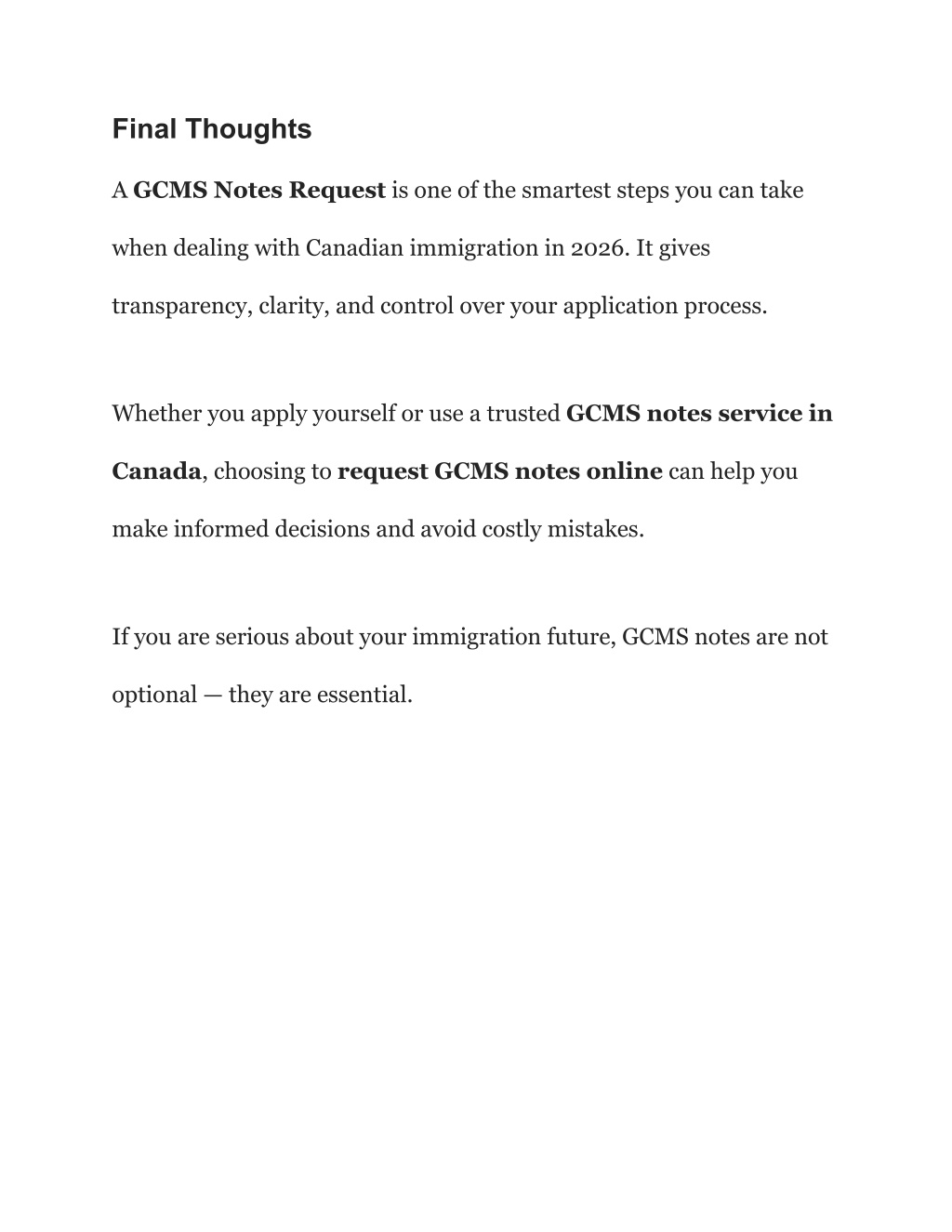 Final Thoughts A GCMS Notes Request is one of the smartest steps you can take when dealing with Canadian immigration in 2026. It gives transparency, clarity, and control over your application process. Whether you apply yourself or use a trusted GCMS notes service in Canada, choosing to request GCMS notes online can help you make informed decisions and avoid costly mistakes. If you are serious about your immigration future, GCMS notes are not optional — they are essential.