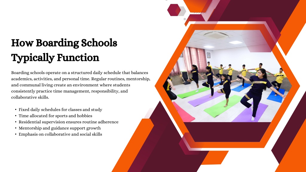 How Boarding Schools Typically Function • Boarding schools operate on a structured daily schedule that balances academics, activities, and personal time. Regular routines, mentorship, and communal living create an environment where students consistently practice time management, responsibility, and collaborative skills. • Fixed daily schedules for classes and study • Time allocated for sports and hobbies • Residential supervision ensures routine adherence • Mentorship and guidance support growth • Emphasis on collaborative and social skills