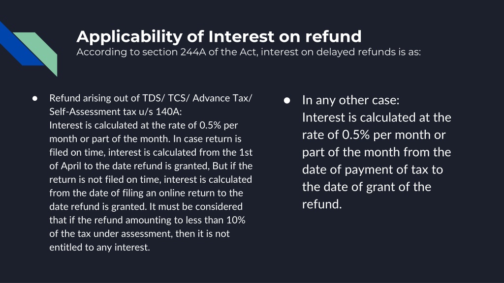 Applicability of Interest on refund According to section 244A of the Act, interest on delayed refunds is as: • Refund arising out of TDS/ TCS/ Advance Tax/ Self-Assessment tax u/s 140A:Interest is calculated at the rate of 0.5% per month or part of the month. In case return is filed on time, interest is calculated from the 1st of April to the date refund is granted, But if the return is not filed on time, interest is calculated from the date of filing an online return to the date refund is granted. It must be considered that if the refund amounting to less than 10% of the tax under assessment, then it is not entitled to any interest. • In any other case:Interest is calculated at the rate of 0.5% per month or part of the month from the date of payment of tax to the date of grant of the refund.