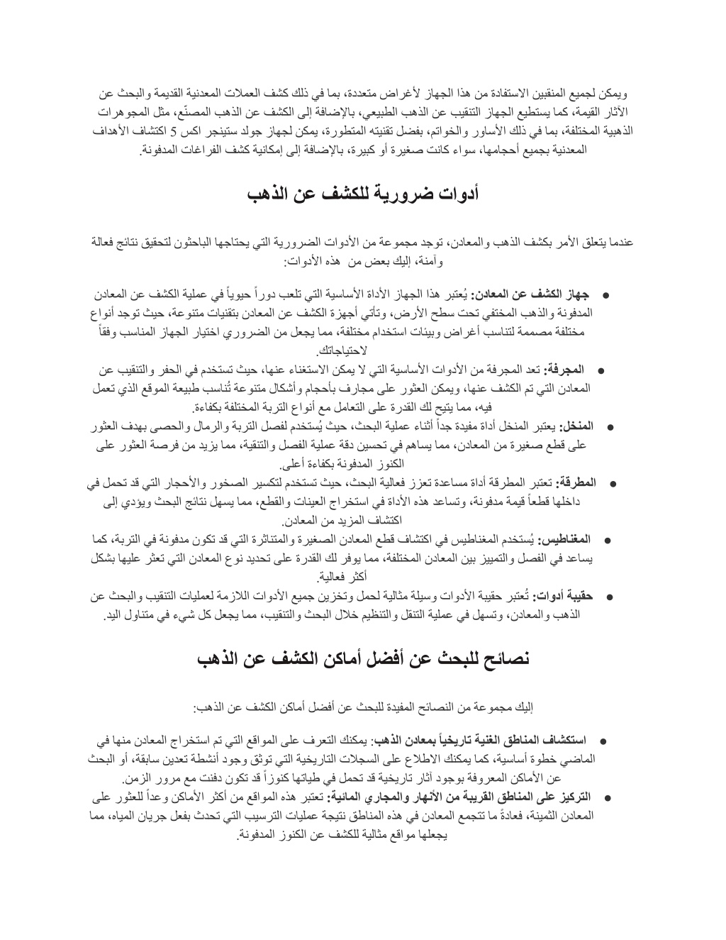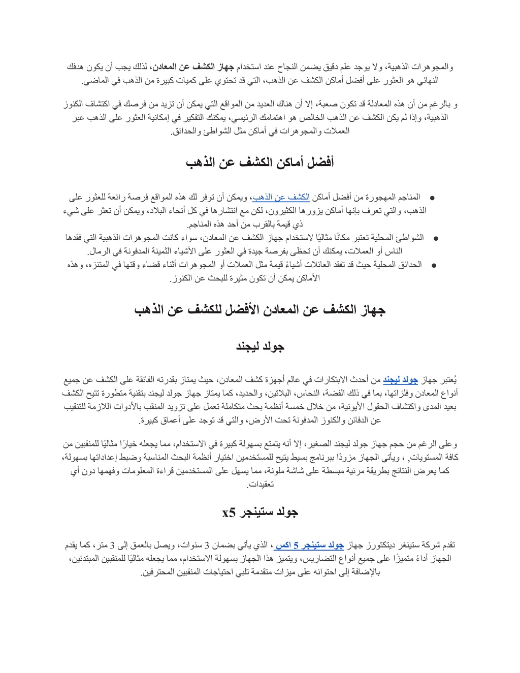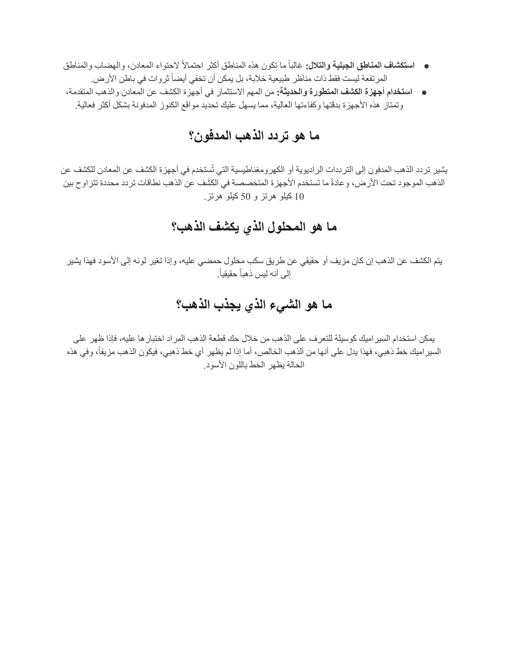 ● ﻖطﺎﻨﻤﻟاو بﺎﻀﮭﻟاو .ضرﻷا ﺐھﺬﻟاو .ﺔﯿﻟﺎﻌﻓ ،ندﺎﻌﻤﻟا ﻲﻓ ﻦطﺎﺑ ندﺎﻌﻤﻟا ﻞﻜﺸﺑ ﺮﺜﻛأ ﻖطﺎﻨﻤﻟا ﺮﺜﻛأ ﻦﻜﻤﯾ نأ ﻲﻔﺨﺗ رﺎﻤﺜﺘﺳﻻا ﻲﻓ ةﺰﮭﺟأ ﻒﺸﻜﻟا ﻦﻋ ﻊﻗاﻮﻣ زﻮﻨﻜﻟا ﺔﻧﻮﻓﺪﻤﻟا ءاﻮﺘﺣﻻ تاوﺮﺛ ًﻻﺎﻤﺘﺣا ًﺎﻀﯾأ هﺬھ ،ﺔﺑﻼﺧ ﻢﮭﻤﻟا ﻞﮭﺴﯾ :لﻼﺘﻟاو تاذ ﺮظﺎﻨﻣ :ﺔﺜﯾﺪﺤﻟاو ﻦﻣ ،ﺔﯿﻟﺎﻌﻟا ﺎﻤﻣ نﻮﻜﺗ ﺎﻣ ًﺎﺒﻟﺎﻏ ﻖطﺎﻨﻤﻟا ﺔﻌﻔﺗﺮﻤﻟا ﺖﺴﯿﻟ ﻂﻘﻓ ﻒﺸﻜﻟا ةرﻮﻄﺘﻤﻟا ةﺰﮭﺟﻷا ﺎﮭﺘﻗﺪﺑ ﺎﮭﺗءﺎﻔﻛو ﺔﯿﻠﺒﺠﻟا فﺎﺸﻜﺘﺳا ﻞﺑ ﺔﯿﻌﯿﺒط ● ،ﺔﻣﺪﻘﺘﻤﻟا ةﺰﮭﺟأ هﺬھ ماﺪﺨﺘﺳا زﺎﺘﻤﺗو ﺪﯾﺪﺤﺗ ﻚﯿﻠﻋ ؟نﻮﻓﺪﻤﻟا ﺐھﺬﻟا ددﺮﺗ ﻮھ ﺎﻣ ﻒﺸﻜﻠﻟ ﻦﻋ حواﺮﺘﺗ ﻦﯿﺑ ندﺎﻌﻤﻟا ةدﺪﺤﻣ ﻒﺸﻜﻟا ﻦﻋ تﺎﻗﺎﻄﻧ ددﺮﺗ ةﺰﮭﺟأ ﺐھﺬﻟا ﻲﻓ ﺔﯿﺴﯿطﺎﻨﻐﻣوﺮﮭﻜﻟا ﺔﺼﺼﺨﺘﻤﻟا ﻲﻓ ﻒﺸﻜﻟا ﻦﻋ ﻮﻠﯿﻛ .ﺰﺗﺮھ مﺪﺨﺘﺴُﺗ ﻲﺘﻟا ﺔﯾﻮﯾداﺮﻟا وأ مﺪﺨﺘﺴﺗ ةﺰﮭﺟﻷا 10 ﻮﻠﯿﻛ ﺰﺗﺮھ و 50 تاددﺮﺘﻟا ًةدﺎﻋو ﺎﻣ ﻰﻟإ ،ضرﻷا نﻮﻓﺪﻤﻟا ﺐھﺬﻟا دﻮﺟﻮﻤﻟا ﺖﺤﺗ ددﺮﺗ ﺮﯿﺸﯾ ﺐھﺬﻟا ؟ﺐھﺬﻟا ﻒﺸﻜﯾ يﺬﻟا لﻮﻠﺤﻤﻟا ﻮھ ﺎﻣ ﺮﯿﺸﯾ اﺬﮭﻓ دﻮﺳﻷا ﻰﻟإ ﮫﻧﻮﻟ ﺮﯿﻐﺗ اذإو ،ﮫﯿﻠﻋ ﻲﻀﻤﺣ لﻮﻠﺤﻣ .ًﺎﯿﻘﯿﻘﺣ ﺐﻜﺳ ًﺎﺒھذ ﻖﯾﺮط ﮫﻧأ ﺲﯿﻟ ﻲﻘﯿﻘﺣ ﻦﻋ ﻰﻟإ وأ ﻒﯾﺰﻣ نﺎﻛ ﺐھﺬﻟا نإ ﻒﺸﻜﻟا ﻦﻋ ﻢﺘﯾ ؟ﺐھﺬﻟا بﺬﺠﯾ يﺬﻟا ءﻲﺸﻟا ﻮھ ﺎﻣ ﻰﻠﻋ هﺬھ ﺮﮭظ ﻲﻓو اذﺈﻓ ،ﮫﯿﻠﻋ ﺐھﺬﻟا ﺎھرﺎﺒﺘﺧا نﻮﻜﯿﻓ داﺮﻤﻟا ،ﻲﺒھذ ﺐھﺬﻟا يأ ﻂﺧ ﺐھﺬﻟا ﻦﻣ لﻼﺧ ،ﺺﻟﺎﺨﻟا ﺎﻣأ اذإ ﻢﻟ ﺮﮭﻈﯾ نﻮﻠﻟﺎﺑ .دﻮﺳﻷا ﺔﻌﻄﻗ ﻚﺣ ﻰﻠﻋ ﺐھﺬﻟا ﺔﻟﺎﺤﻟا فﺮﻌﺘﻠﻟ ﺎﮭﻧأ ﻦﻣ ﺔﻠﯿﺳﻮﻛ ﻰﻠﻋ ﻚﯿﻣاﺮﯿﺴﻟا اﺬﮭﻓ لﺪﯾ ماﺪﺨﺘﺳا ﻦﻜﻤﯾ ﻚﯿﻣاﺮﯿﺴﻟا ﻂﺧ ،ًﺎﻔﯾﺰﻣ ،ﻲﺒھذ ﻂﺨﻟا ﺮﮭﻈﯾ