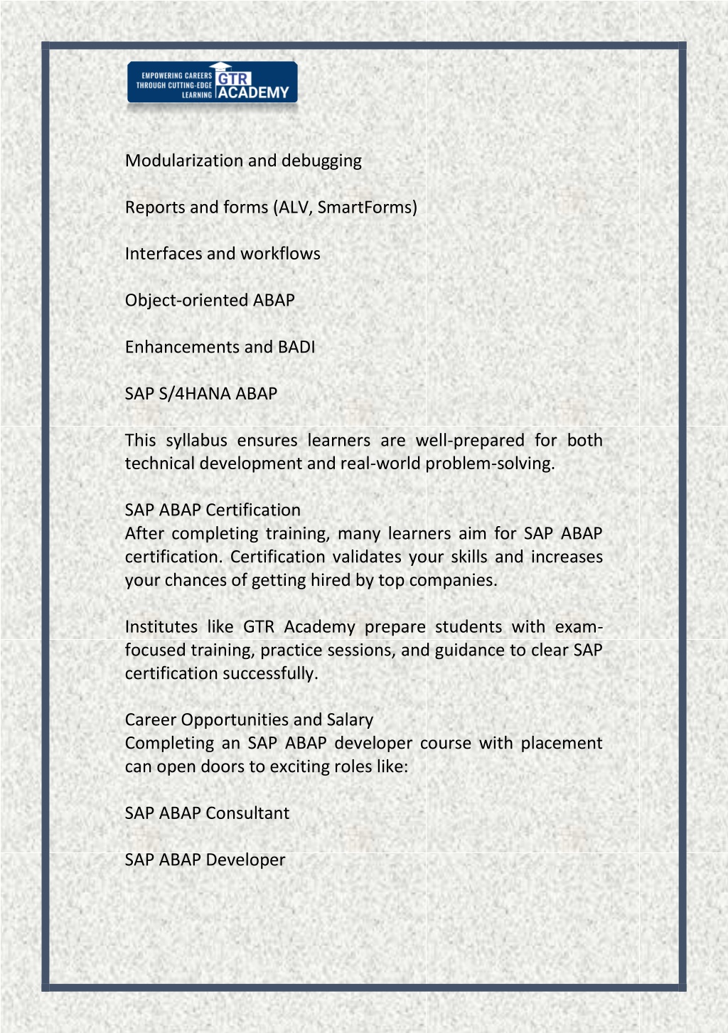 Modularization and debugging Reports and forms (ALV, SmartForms) Interfaces and workflows Object-oriented ABAP Enhancements and BADI SAP S/4HANA ABAP This syllabus ensures learners are well-prepared for both technical development and real-world problem-solving. SAP ABAP Certification After completing training, many learners aim for SAP ABAP certification. Certification validates your skills and increases your chances of getting hired by top companies. Institutes like GTR Academy prepare students with exam- focused training, practice sessions, and guidance to clear SAP certification successfully. Career Opportunities and Salary Completing an SAP ABAP developer course with placement can open doors to exciting roles like: SAP ABAP Consultant SAP ABAP Developer