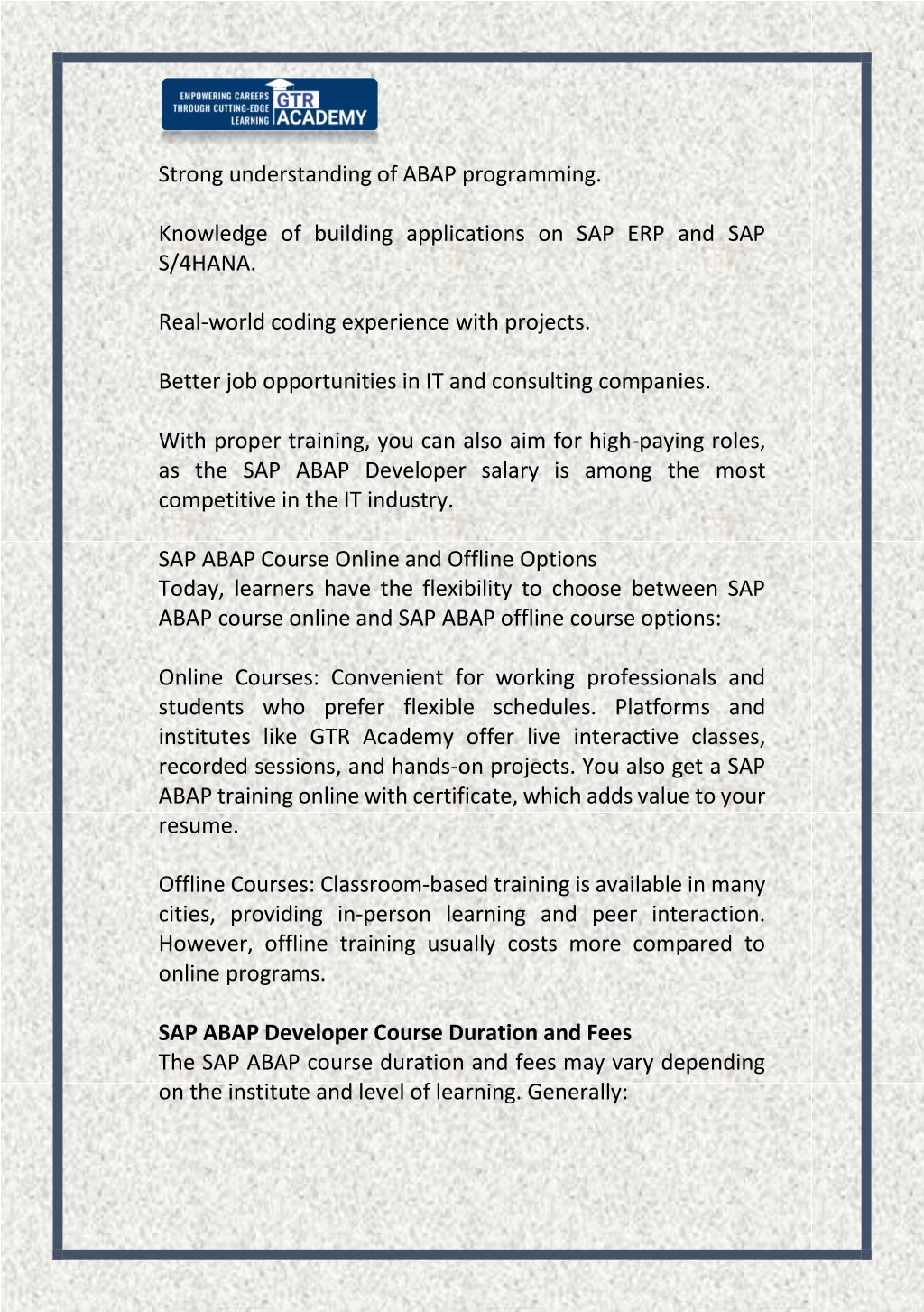 Strong understanding of ABAP programming. Knowledge of building applications on SAP ERP and SAP S/4HANA. Real-world coding experience with projects. Better job opportunities in IT and consulting companies. With proper training, you can also aim for high-paying roles, as the SAP ABAP Developer salary is among the most competitive in the IT industry. SAP ABAP Course Online and Offline Options Today, learners have the flexibility to choose between SAP ABAP course online and SAP ABAP offline course options: Online Courses: Convenient for working professionals and students who prefer flexible schedules. Platforms and institutes like GTR Academy offer live interactive classes, recorded sessions, and hands-on projects. You also get a SAP ABAP training online with certificate, which adds value to your resume. Offline Courses: Classroom-based training is available in many cities, providing in-person learning and peer interaction. However, offline training usually costs more compared to online programs. SAP ABAP Developer Course Duration and Fees The SAP ABAP course duration and fees may vary depending on the institute and level of learning. Generally: