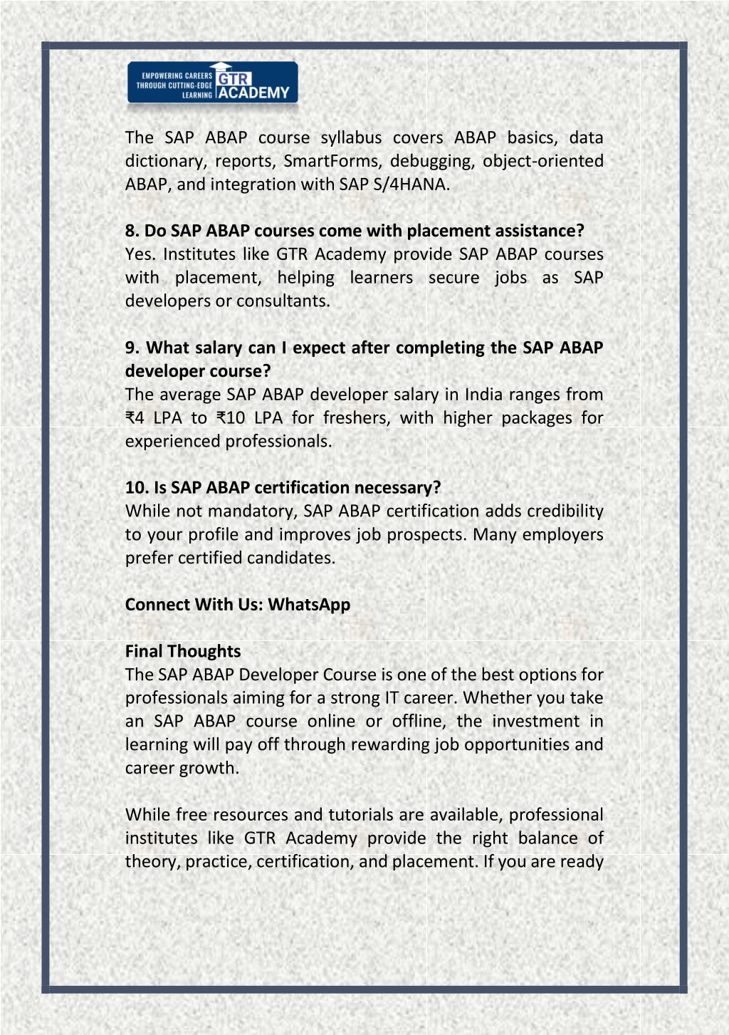 The SAP ABAP course syllabus covers ABAP basics, data dictionary, reports, SmartForms, debugging, object-oriented ABAP, and integration with SAP S/4HANA. 8. Do SAP ABAP courses come with placement assistance? Yes. Institutes like GTR Academy provide SAP ABAP courses with placement, helping learners secure jobs as SAP developers or consultants. 9. What salary can I expect after completing the SAP ABAP developer course? The average SAP ABAP developer salary in India ranges from ₹4 LPA to ₹10 LPA for freshers, with higher packages for experienced professionals. 10. Is SAP ABAP certification necessary? While not mandatory, SAP ABAP certification adds credibility to your profile and improves job prospects. Many employers prefer certified candidates. Connect With Us: WhatsApp Final Thoughts The SAP ABAP Developer Course is one of the best options for professionals aiming for a strong IT career. Whether you take an SAP ABAP course online or offline, the investment in learning will pay off through rewarding job opportunities and career growth. While free resources and tutorials are available, professional institutes like GTR Academy provide the right balance of theory, practice, certification, and placement. If you are ready