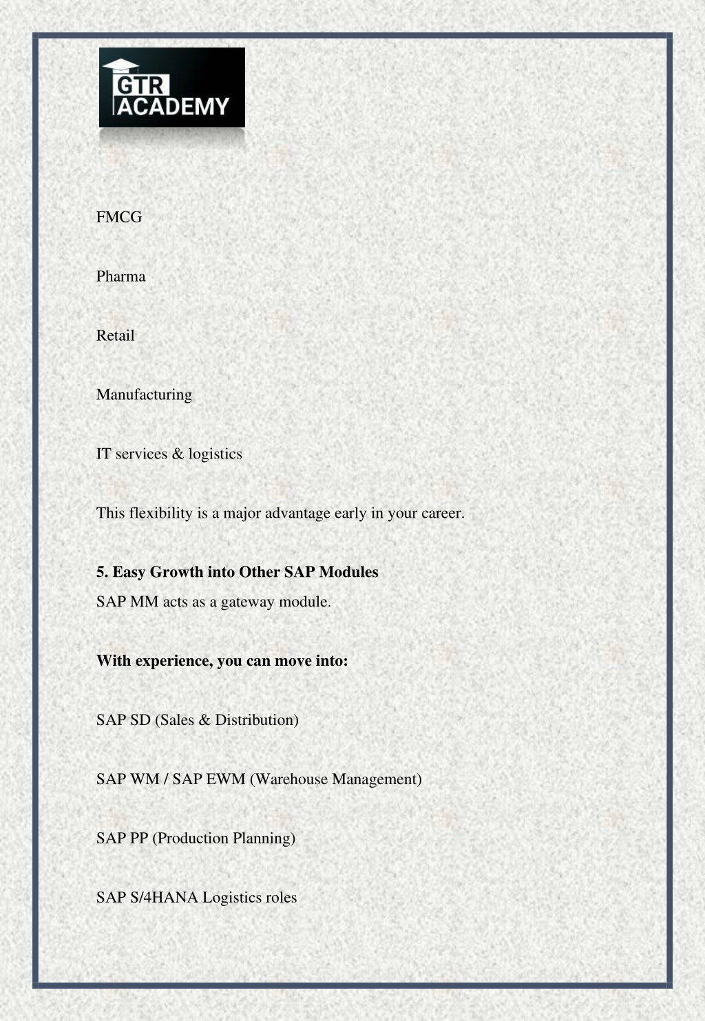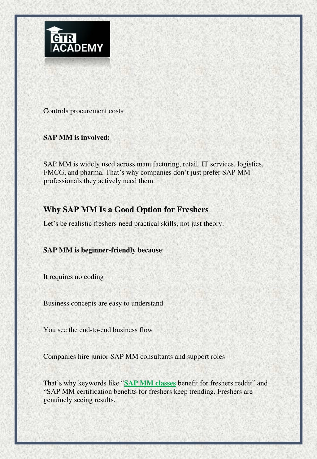 8. PDFs help with theory PDFs do NOT build confidence Real confidence comes from: Live SAP systems Scenario-based learning Practical assignments Mentor feedback This is where good institutes matter. Why GTR Academy Is Ideal for SAP MM Freshers After reviewing multiple SAP training institutes, GTR Academy consistently stands out—especially for beginners. What Sets GTR Academy Apart Beginner-friendly teaching approach