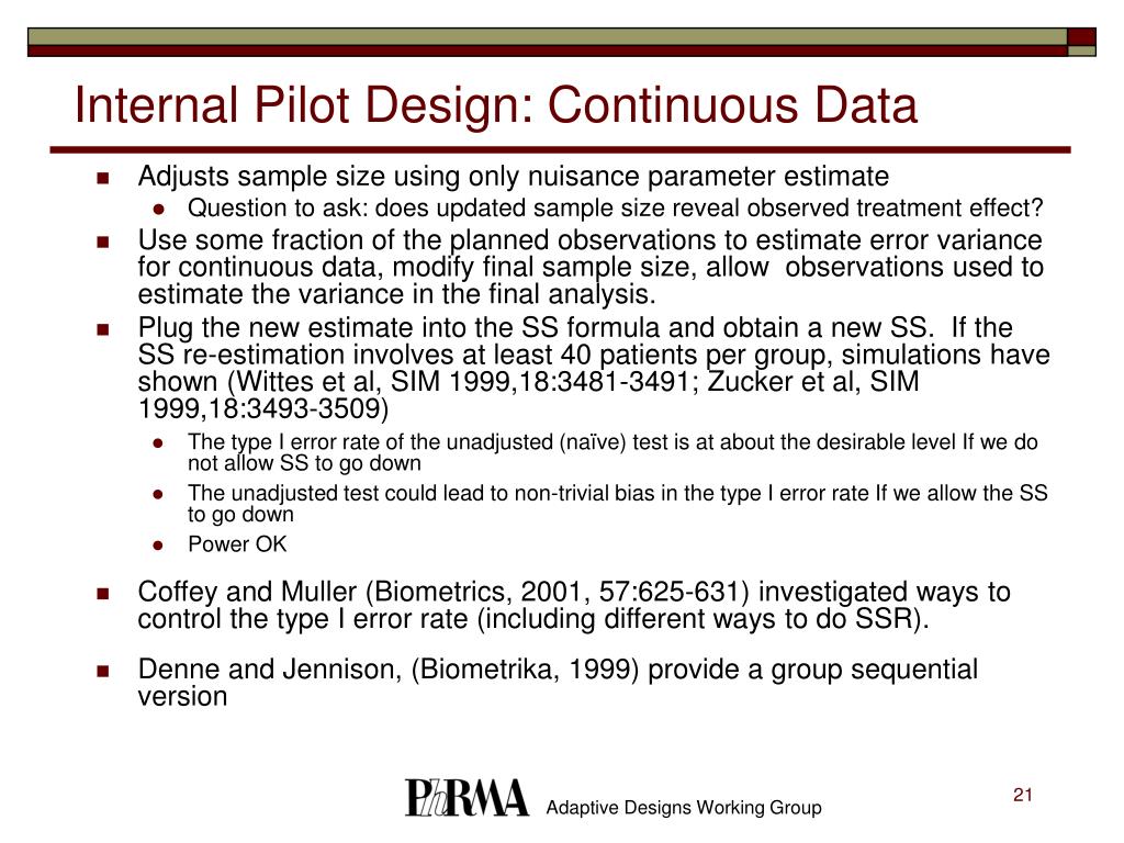 Internal Pilot Design: Continuous Data • Adjusts sample size using only nuisance parameter estimate • Question to ask: does updated sample size reveal observed treatment effect? • Use some fraction of the planned observations to estimate error variance for continuous data, modify final sample size, allow observations used to estimate the variance in the final analysis. • Plug the new estimate into the SS formula and obtain a new SS. If the SS re-estimation involves at least 40 patients per group, simulations have shown (Wittes et al, SIM 1999,18:3481-3491; Zucker et al, SIM 1999,18:3493-3509) • The type I error rate of the unadjusted (naïve) test is at about the desirable level If we do not allow SS to go down • The unadjusted test could lead to non-trivial bias in the type I error rate If we allow the SS to go down • Power OK • Coffey and Muller (Biometrics, 2001, 57:625-631) investigated ways to control the type I error rate (including different ways to do SSR). • Denne and Jennison, (Biometrika, 1999) provide a group sequential version