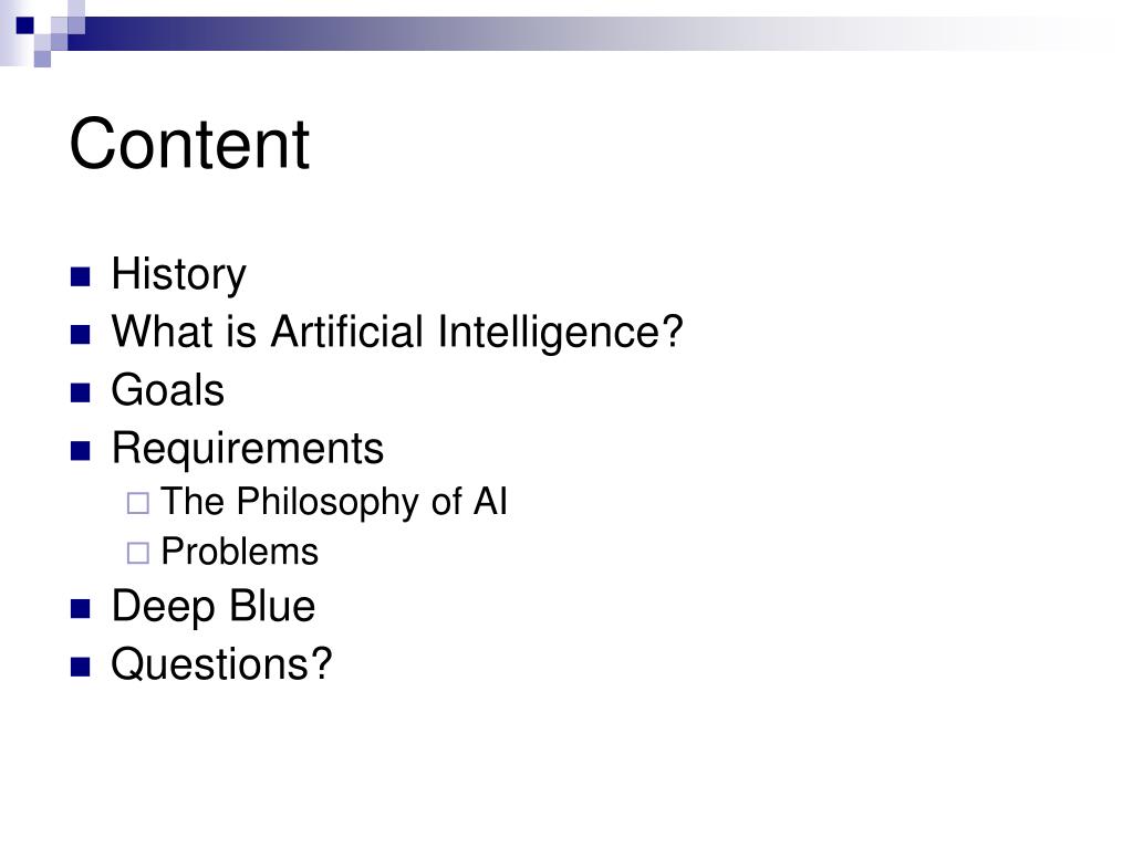 Content • History • What is Artificial Intelligence? • Goals • Requirements • The Philosophy of AI • Problems • Deep Blue • Questions?