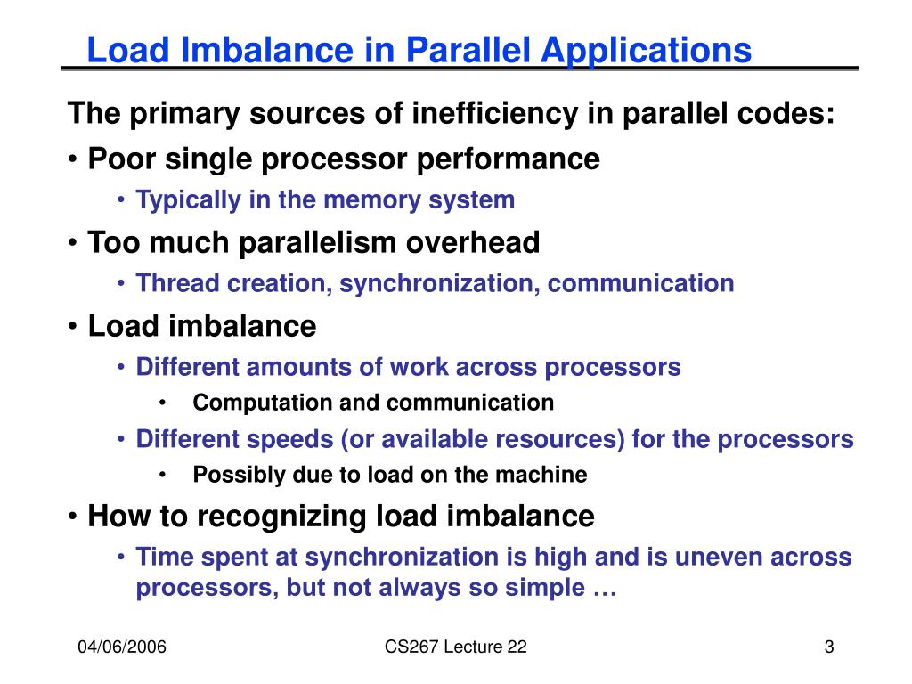 Load Imbalance in Parallel Applications The primary sources of inefficiency in parallel codes: • Poor single processor performance • Typically in the memory system • Too much parallelism overhead • Thread creation, synchronization, communication • Load imbalance • Different amounts of work across processors • Computation and communication • Different speeds (or available resources) for the processors • Possibly due to load on the machine • How to recognizing load imbalance • Time spent at synchronization is high and is uneven across processors, but not always so simple … CS267 Lecture 22