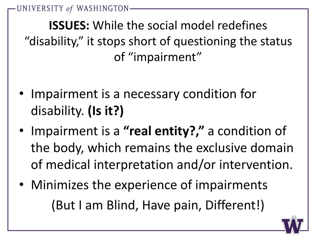 ISSUES: While the social model redefines “disability,” it stops short of questioning the status of “impairment” • Impairment is a necessary condition for disability. (Is it?) • Impairment is a “real entity?,” a condition of the body, which remains the exclusive domain of medical interpretation and/or intervention. • Minimizes the experience of impairments (But I am Blind, Have pain, Different!)