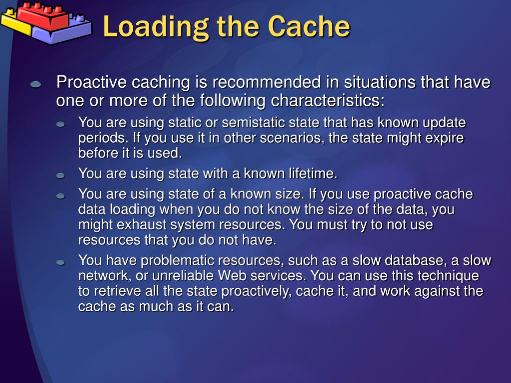 Loading the Cache • Proactive caching is recommended in situations that have one or more of the following characteristics: • You are using static or semistatic state that has known update periods. If you use it in other scenarios, the state might expire before it is used. • You are using state with a known lifetime. • You are using state of a known size. If you use proactive cache data loading when you do not know the size of the data, you might exhaust system resources. You must try to not use resources that you do not have. • You have problematic resources, such as a slow database, a slow network, or unreliable Web services. You can use this technique to retrieve all the state proactively, cache it, and work against the cache as much as it can.