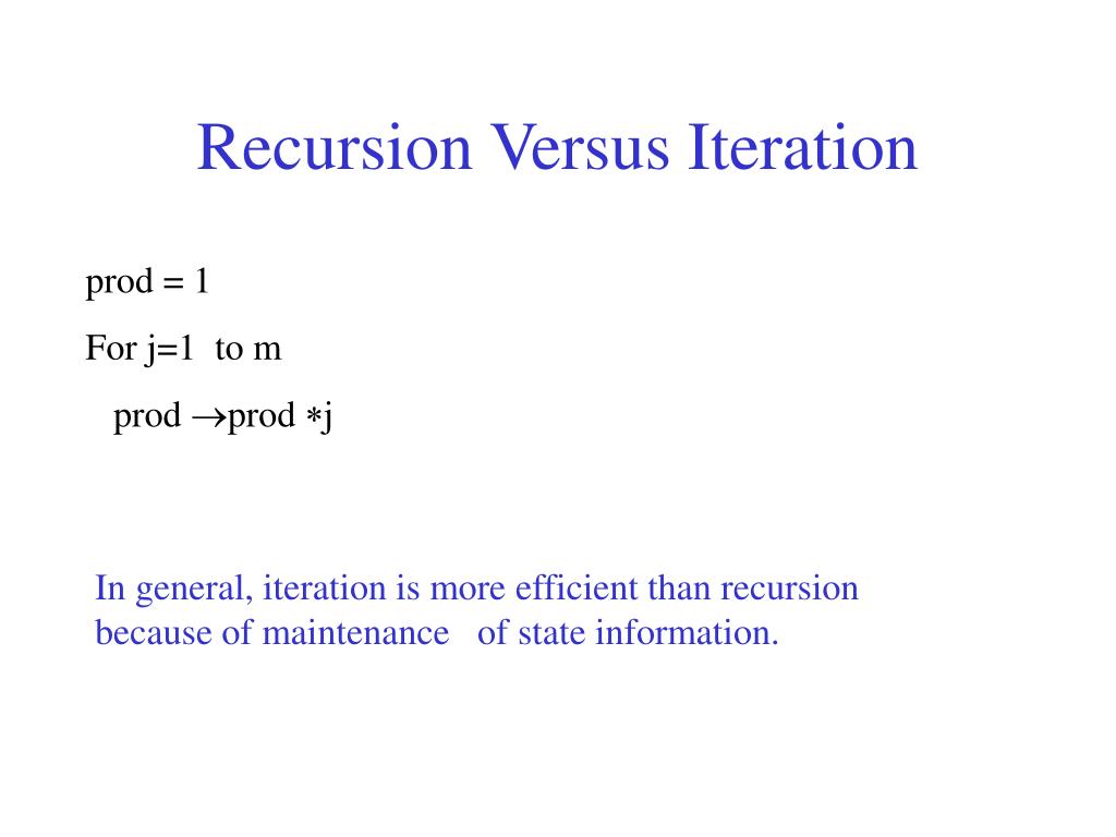 Recursion Versus Iteration prod = 1 For j=1 to m prod prod j In general, iteration is more efficient than recursion because of maintenance of state information.