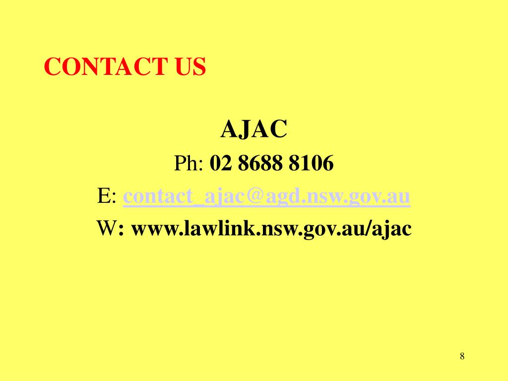 CONTACT US AJAC Ph: 02 8688 8106 E: contact_ajac@agd.nsw.gov.au W: www.lawlink.nsw.gov.au/ajac