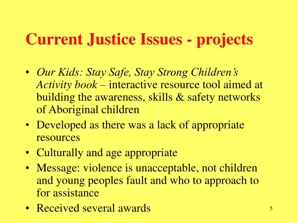 Current Justice Issues - projects • Our Kids: Stay Safe, Stay Strong Children’s Activity book – interactive resource tool aimed at building the awareness, skills & safety networks of Aboriginal children • Developed as there was a lack of appropriate resources • Culturally and age appropriate • Message: violence is unacceptable, not children and young peoples fault and who to approach to for assistance • Received several awards