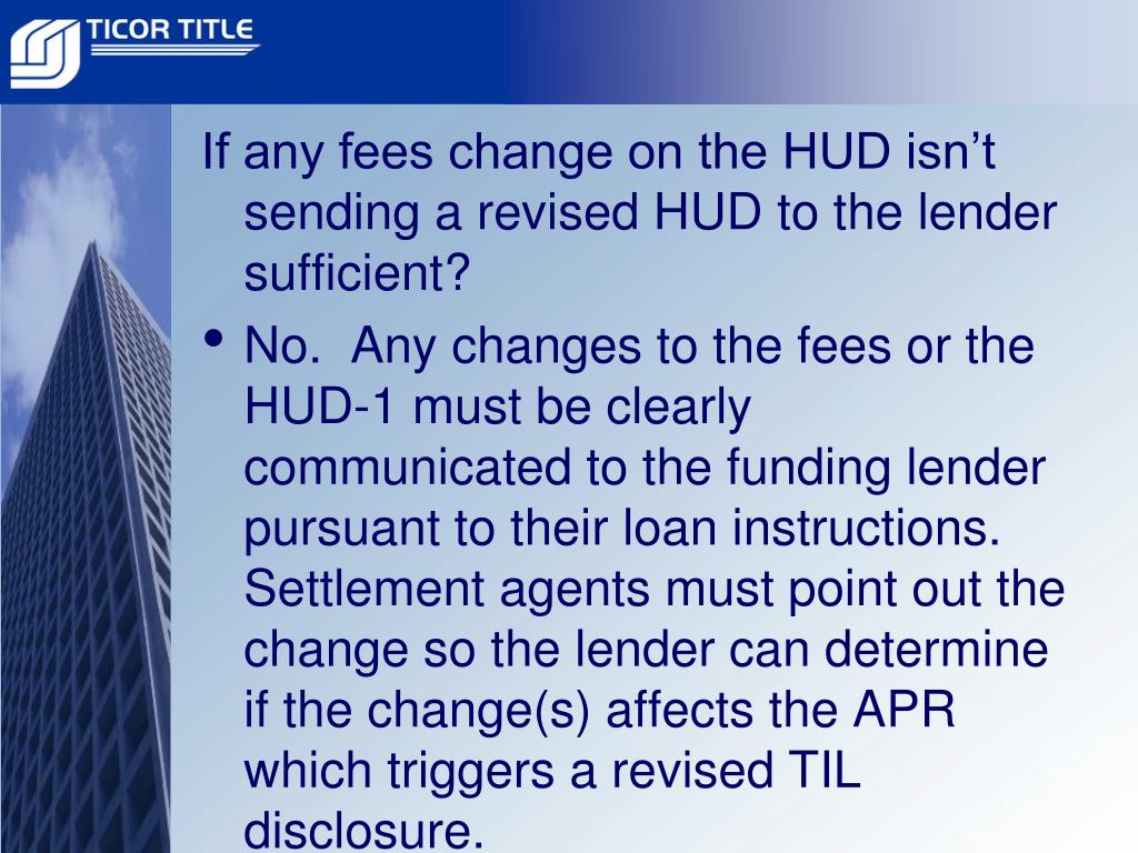 If any fees change on the HUD isn’t sending a revised HUD to the lender sufficient? • No. Any changes to the fees or the HUD-1 must be clearly communicated to the funding lender pursuant to their loan instructions. Settlement agents must point out the change so the lender can determine if the change(s) affects the APR which triggers a revised TIL disclosure.