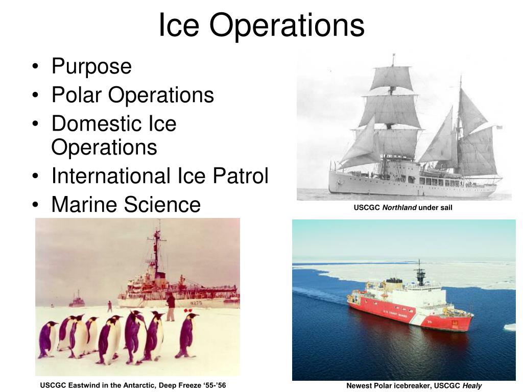 Ice Operations • Purpose • Polar Operations • Domestic Ice Operations • International Ice Patrol • Marine Science USCGC Northland under sail USCGC Eastwind in the Antarctic, Deep Freeze ‘55-’56 Newest Polar icebreaker, USCGC Healy