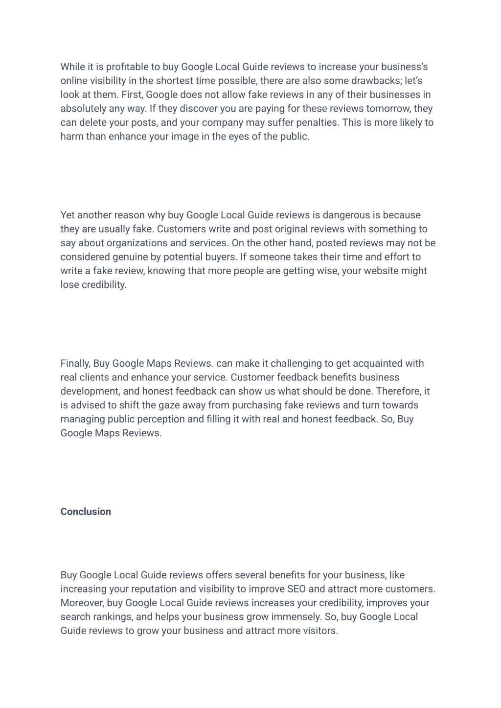 While it is profitable to buy Google Local Guide reviews to increase your business’s online visibility in the shortest time possible, there are also some drawbacks; let’s look at them. First, Google does not allow fake reviews in any of their businesses in absolutely any way. If they discover you are paying for these reviews tomorrow, they can delete your posts, and your company may suffer penalties. This is more likely to harm than enhance your image in the eyes of the public. Yet another reason why buy Google Local Guide reviews is dangerous is because they are usually fake. Customers write and post original reviews with something to say about organizations and services. On the other hand, posted reviews may not be considered genuine by potential buyers. If someone takes their time and effort to write a fake review, knowing that more people are getting wise, your website might lose credibility. Finally, Buy Google Maps Reviews. can make it challenging to get acquainted with real clients and enhance your service. Customer feedback benefits business development, and honest feedback can show us what should be done. Therefore, it is advised to shift the gaze away from purchasing fake reviews and turn towards managing public perception and filling it with real and honest feedback. So, Buy Google Maps Reviews. Conclusion Buy Google Local Guide reviews offers several benefits for your business, like increasing your reputation and visibility to improve SEO and attract more customers. Moreover, buy Google Local Guide reviews increases your credibility, improves your search rankings, and helps your business grow immensely. So, buy Google Local Guide reviews to grow your business and attract more visitors.