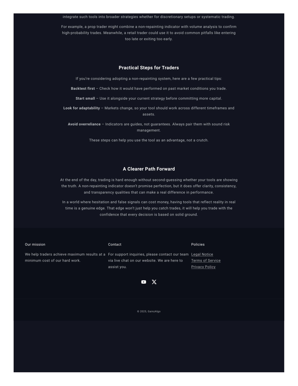 integrate such tools into broader strategies whether for discretionary setups or systematic trading. For example, a prop trader might combine a non-repainting indicator with volume analysis to confirm high-probability trades. Meanwhile, a retail trader could use it to avoid common pitfalls like entering too late or exiting too early. Practical Steps for Traders If you’re considering adopting a non-repainting system, here are a few practical tips: Backtest first – Check how it would have performed on past market conditions you trade. Start small – Use it alongside your current strategy before committing more capital. Look for adaptability – Markets change, so your tool should work across different timeframes and assets. Avoid overreliance – Indicators are guides, not guarantees. Always pair them with sound risk management. These steps can help you use the tool as an advantage, not a crutch. A Clearer Path Forward At the end of the day, trading is hard enough without second-guessing whether your tools are showing the truth. A non-repainting indicator doesn’t promise perfection, but it does offer clarity, consistency, and transparency qualities that can make a real difference in performance. In a world where hesitation and false signals can cost money, having tools that reflect reality in real time is a genuine edge. That edge won’t just help you catch trades, it will help you trade with the confidence that every decision is based on solid ground. Our mission Contact Policies We help traders achieve maximum results at a For support inquiries, please contact our team Legal Notice minimum cost of our hard work. via live chat on our website. We are here to Terms of Service assist you. Privacy Policy © 2025, GainzAlgo