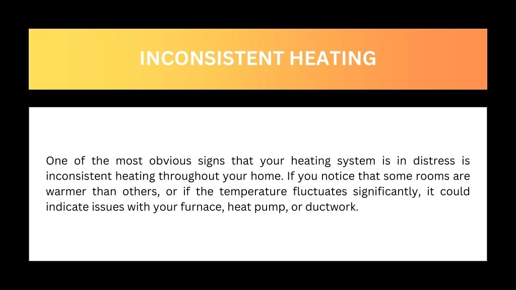 INCONSISTENT HEATING One of the most obvious signs that your heating system is in distress is inconsistent heating throughout your home. If you notice that some rooms are warmer than others, or if the temperature fluctuates significantly, it could indicate issues with your furnace, heat pump, or ductwork.