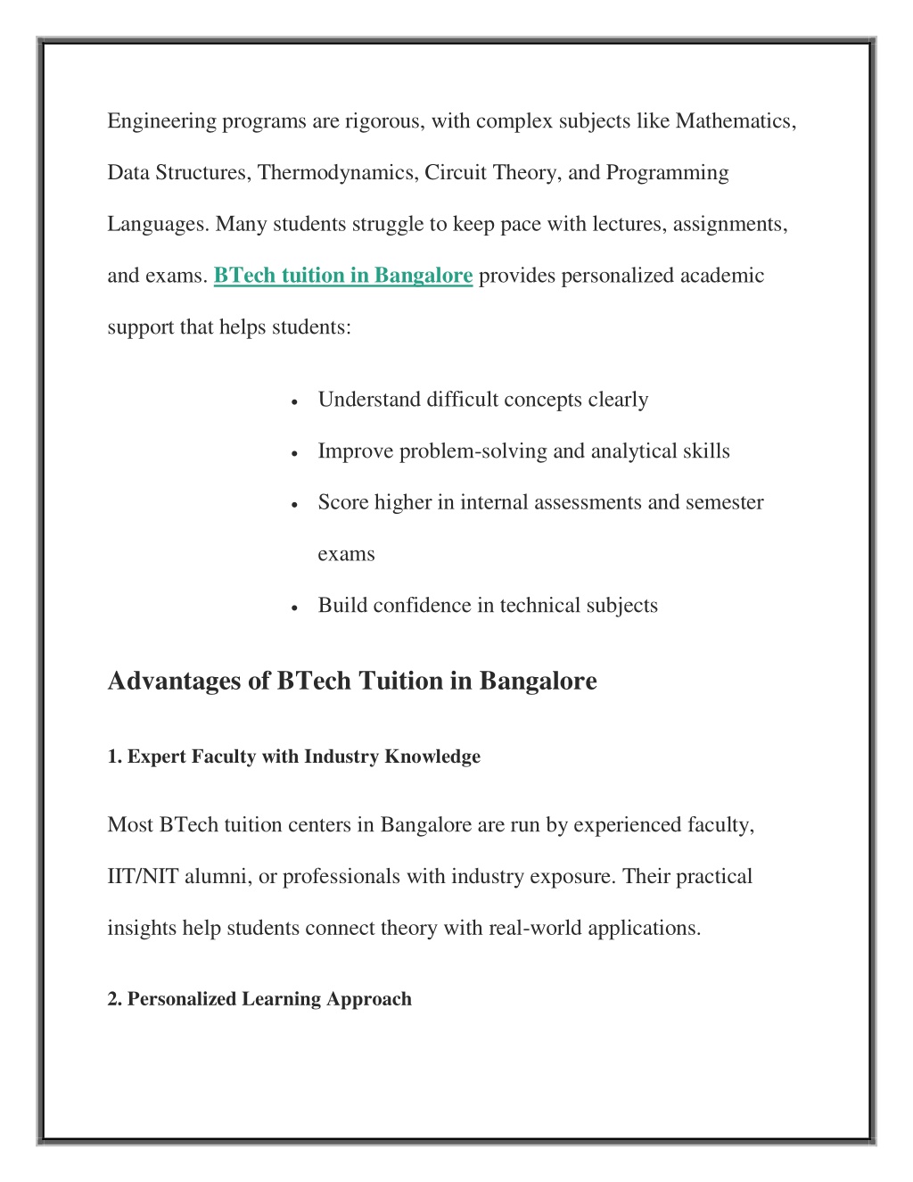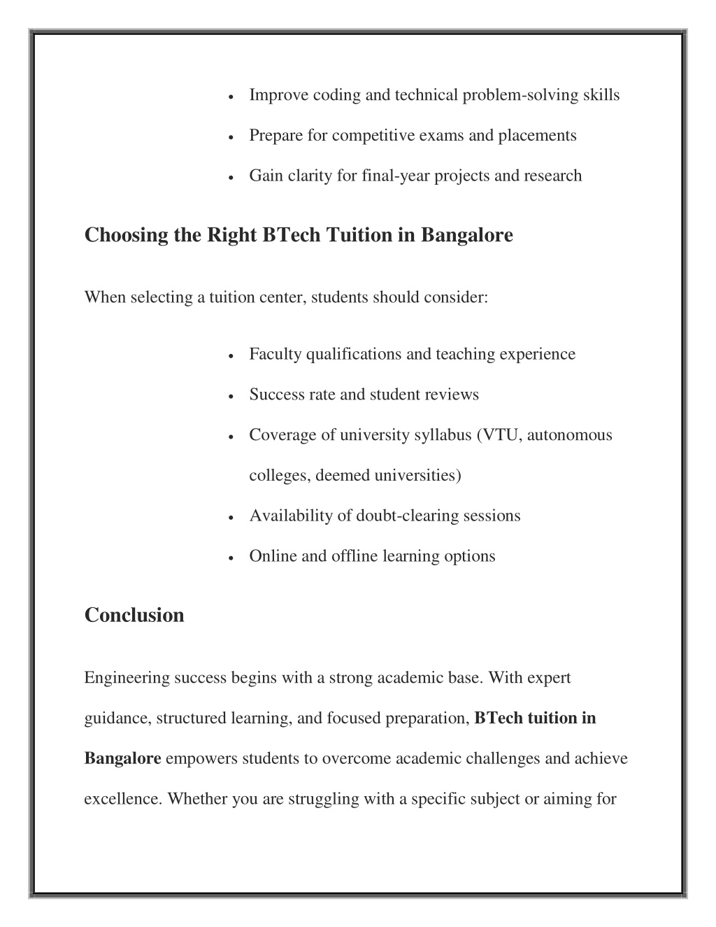 Improve coding and technical problem-solving skills Prepare for competitive exams and placements Gain clarity for final-year projects and research Choosing the Right BTech Tuition in Bangalore When selecting a tuition center, students should consider: Faculty qualifications and teaching experience Success rate and student reviews Coverage of university syllabus (VTU, autonomous colleges, deemed universities) Availability of doubt-clearing sessions Online and offline learning options Conclusion Engineering success begins with a strong academic base. With expert guidance, structured learning, and focused preparation, BTech tuition in Bangalore empowers students to overcome academic challenges and achieve excellence. Whether you are struggling with a specific subject or aiming for