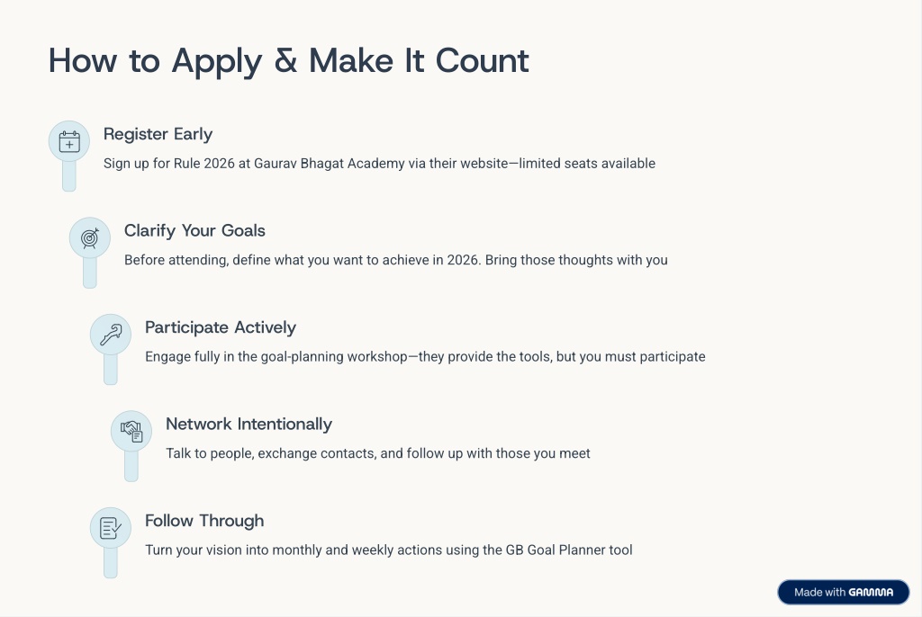 8. How to Apply & Make It Count Register Early Sign up for Rule 2026 at Gaurav Bhagat Academy via their website4limited seats available Clarify Your Goals Before attending, define what you want to achieve in 2026. Bring those thoughts with you Participate Actively Engage fully in the goal-planning workshop4they provide the tools, but you must participate Network Intentionally Talk to people, exchange contacts, and follow up with those you meet Follow Through Turn your vision into monthly and weekly actions using the GB Goal Planner tool
