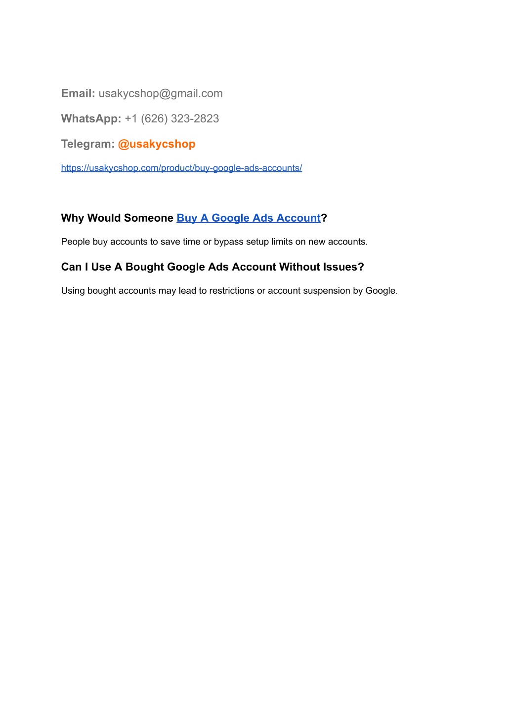 Buy Google Ads Accounts: Boost Your Campaigns Instantly! If you want to buy Google Ads accounts, you are in the right place. This article explains everything in a simple way. You will learn what Google Ads accounts are, why people buy them, and how to do it safely. Email: usakycshop@gmail.com WhatsApp: +1 (626) 323-2823 Telegram: @usakycshop https://usakycshop.com/product/buy-google-ads-accounts/ What Are Google Ads Accounts? A Google Ads account is a special account you use to show ads on Google. These ads appear on Google search results or on websites. Businesses use Google Ads to get more customers. When you have a Google Ads account, you can create ads, set budgets, and choose who sees your ads. It helps you tell people about your products or services. Why Do People Want to Buy Google Ads Accounts? Sometimes, people want to buy Google Ads accounts instead of creating new ones. Here are some reasons why: ● Quick Start: Buying an account lets you start advertising faster. ● Account History: Some accounts have good history, which helps ads perform better. ● Bypass Restrictions: New accounts sometimes have limits. Older accounts may have fewer limits. ● Multiple Accounts: Businesses may want many accounts for different ads. Is It Safe to Buy Google Ads Accounts? Buying Google Ads accounts can be tricky. Google has rules about accounts. If you buy an account that breaks rules, it can be closed.