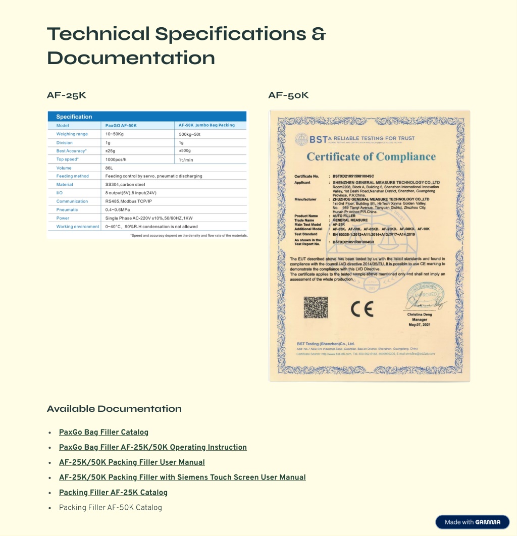 Technical Specifications & Documentation AF-25K AF-50K Available Documentation PaxGo Bag Filler Catalog PaxGo Bag Filler AF-25K/50K Operating Instruction AF-25K/50K Packing Filler User Manual AF-25K/50K Packing Filler with Siemens Touch Screen User Manual Packing Filler AF-25K Catalog Packing Filler AF-50K Catalog