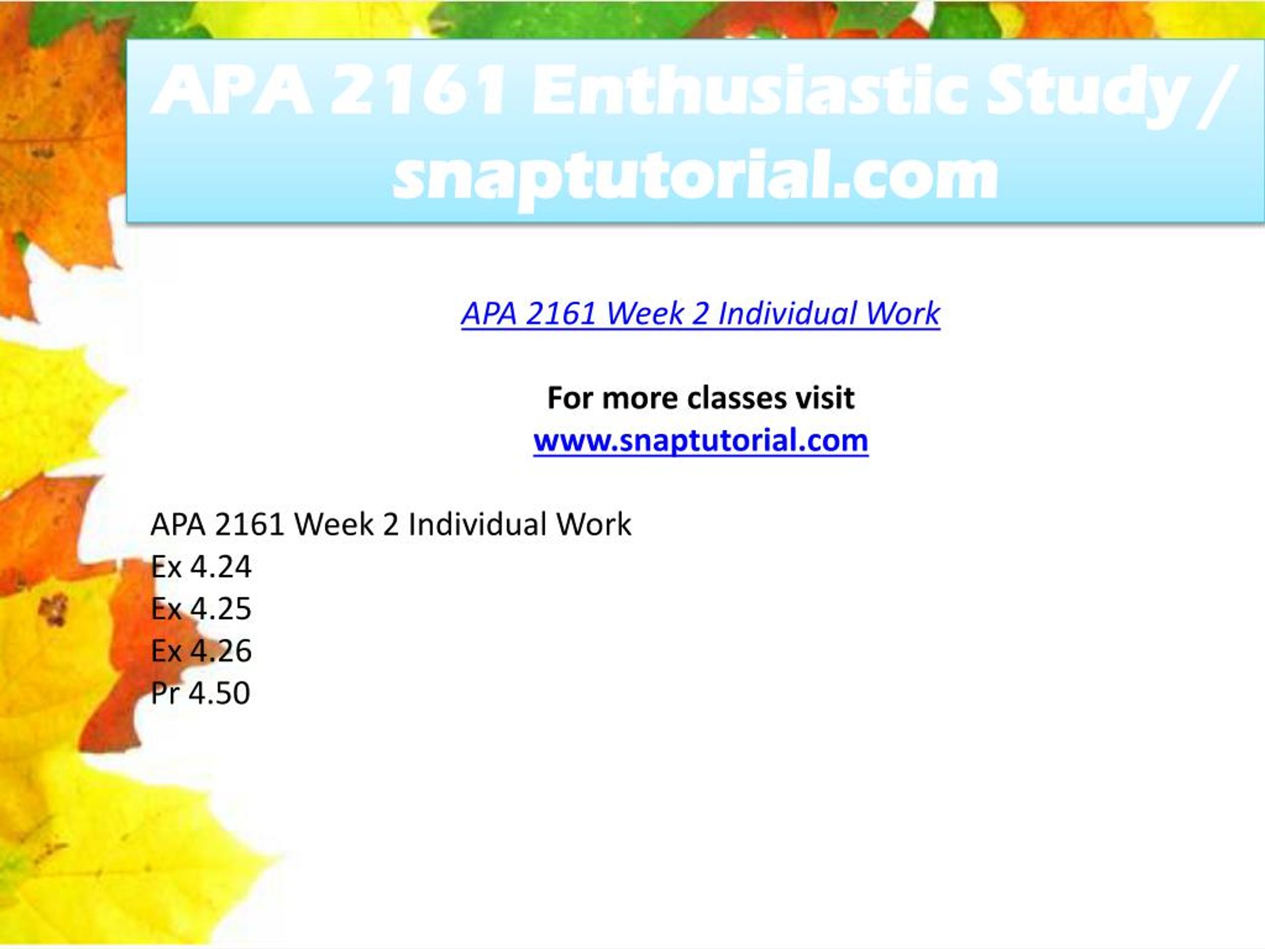 APA 2161 Enthusiastic Study / snaptutorial.com APA 2161 Week 1 Individual Work For more classes visit www.snaptutorial.com APA 2161 Week 1 Individual Work