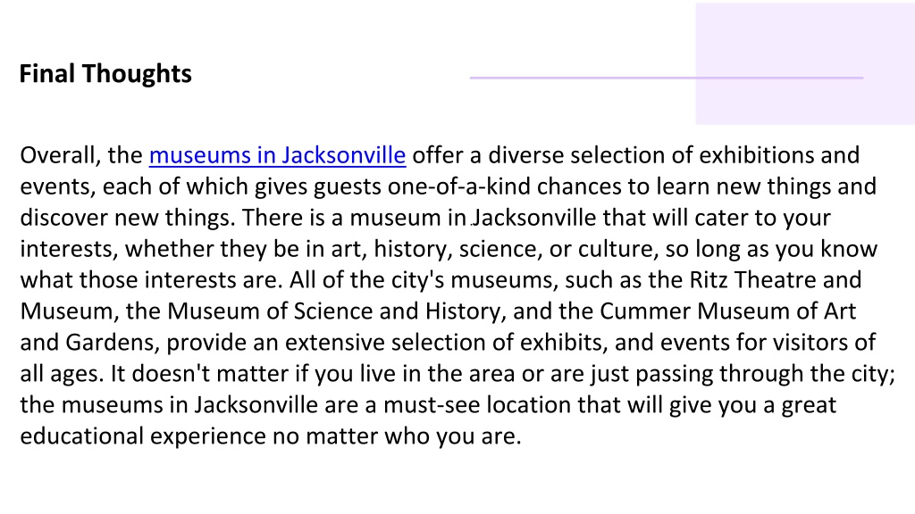 <br>Jacksonville museums are essential for exploring the city's rich culture and history. The Jacksonville Museum of Modern Art, Cummer Museum, Museum of Science and History, and others offer everything from local history to contemporary art.