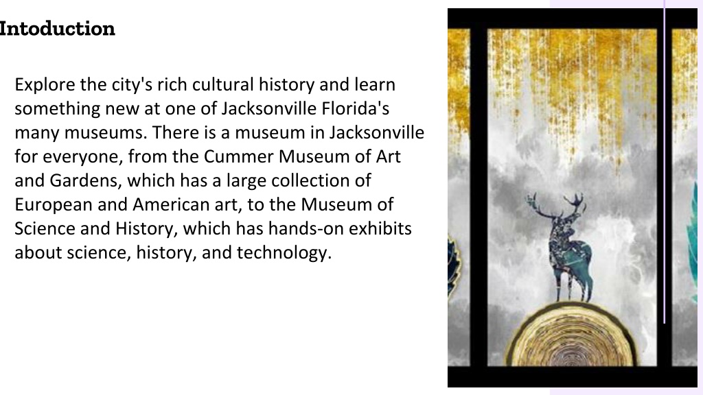 Intoduction Explore the city's rich cultural history and learn something new at one of Jacksonville Florida's many museums. There is a museum in Jacksonville for everyone, from the Cummer Museum of Art and Gardens, which has a large collection of European and American art, to the Museum of Science and History, which has hands-on exhibits about science, history, and technology.