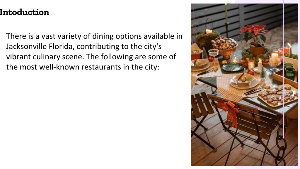 Intoduction There is a vast variety of dining options available in Jacksonville Florida, contributing to the city's vibrant culinary scene. The following are some of the most well-known restaurants in the city: