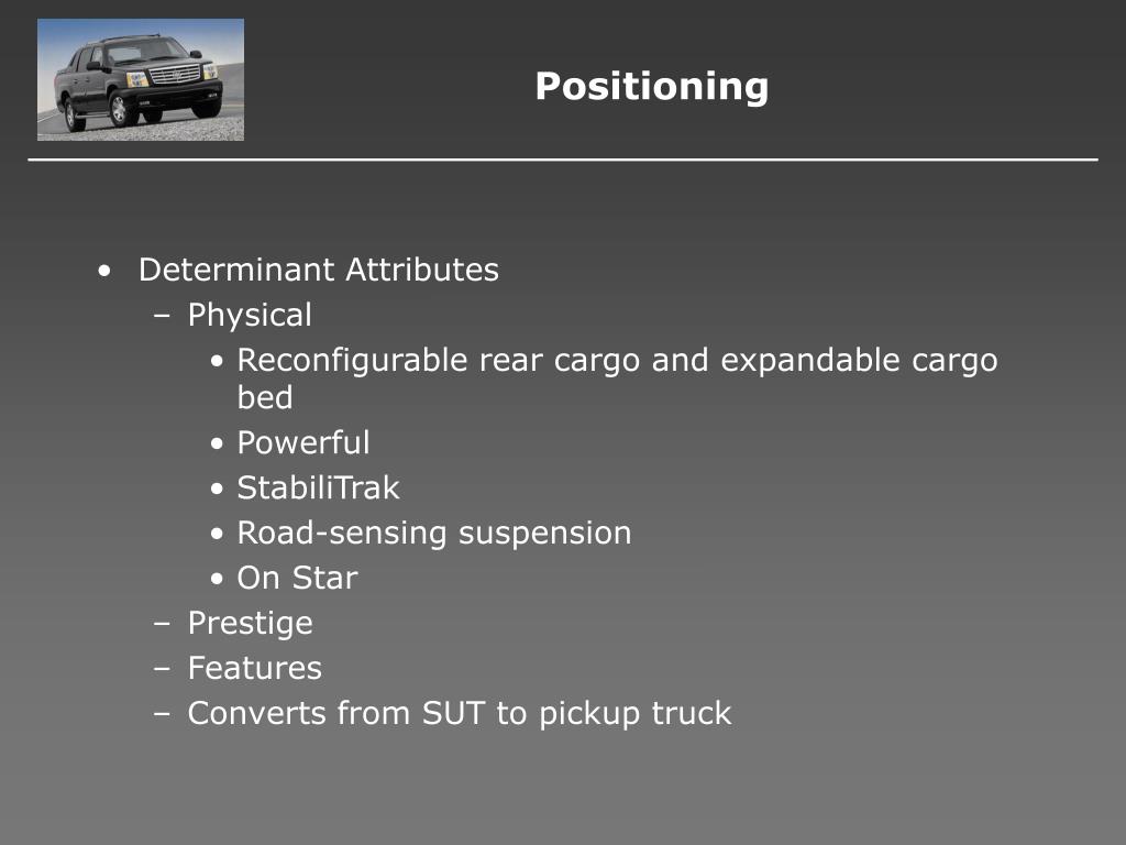 Positioning • Determinant Attributes • Physical • Reconfigurable rear cargo and expandable cargo bed • Powerful • StabiliTrak • Road-sensing suspension • On Star • Prestige • Features • Converts from SUT to pickup truck