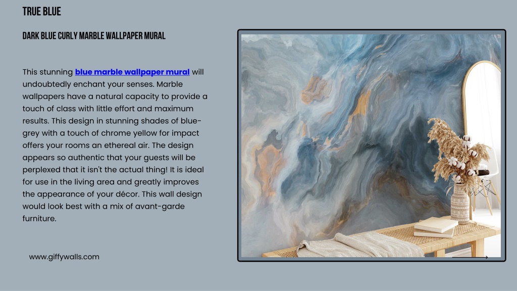 True Blue DARK BLUE CURLY MARBLE WALLPAPER MURAL This stunning blue marble wallpaper mural will undoubtedly enchant your senses. Marble wallpapers have a natural capacity to provide a touch of class with little effort and maximum results. This design in stunning shades of blue-grey with a touch of chrome yellow for impact offers your rooms an ethereal air. The design appears so authentic that your guests will be perplexed that it isn't the actual thing! It is ideal for use in the living area and greatly improves the appearance of your décor. This wall design would look best with a mix of avant-garde furniture. www.giffywalls.com