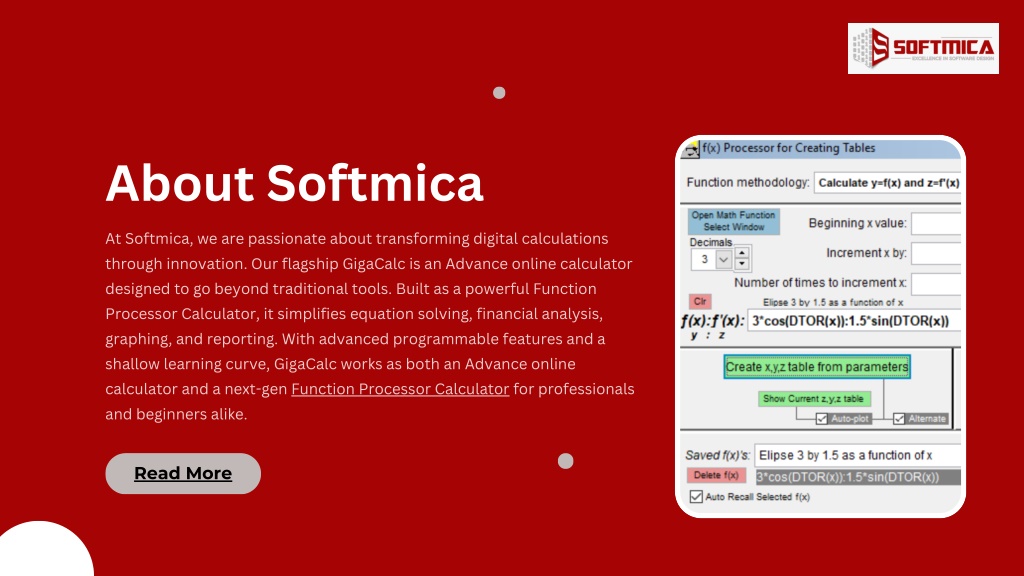 About Softmica At Softmica, we are passionate about transforming digital calculations through innovation. Our flagship GigaCalc is an Advance online calculator designed to go beyond traditional tools. Built as a powerful Function Processor Calculator, it simplifies equation solving, financial analysis, graphing, and reporting. With advanced programmable features and a shallow learning curve, GigaCalc works as both an Advance online calculator and a next-gen Function Processor Calculator for professionals and beginners alike. Read More