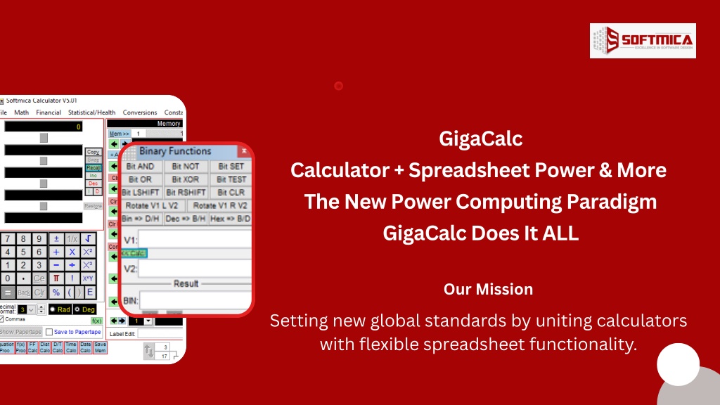 GigaCalc Calculator + Spreadsheet Power & More The New Power Computing Paradigm GigaCalc Does It ALL Our Mission Setting new global standards by uniting calculators with flexible spreadsheet functionality.