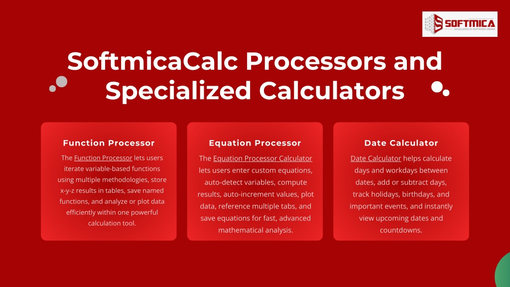 SoftmicaCalc Processors and Specialized Calculators Function Processor Equation Processor Date Calculator The Function Processor lets users iterate variable-based functions using multiple methodologies, store x-y-z results in tables, save named functions, and analyze or plot data efficiently within one powerful calculation tool. The Equation Processor Calculator lets users enter custom equations, auto-detect variables, compute results, auto-increment values, plot data, reference multiple tabs, and save equations for fast, advanced mathematical analysis. Date Calculator helps calculate days and workdays between dates, add or subtract days, track holidays, birthdays, and important events, and instantly view upcoming dates and countdowns.