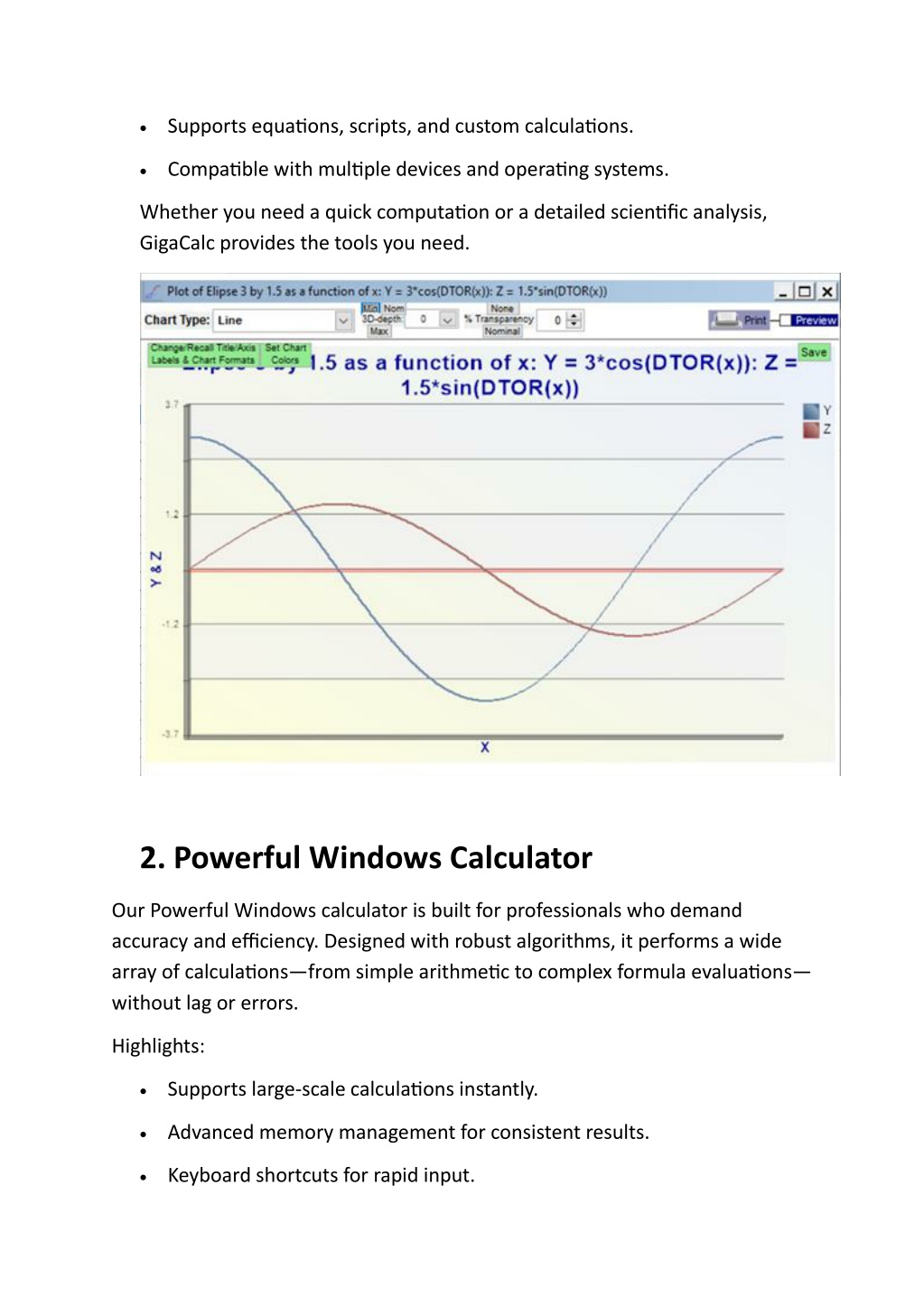 2. •Supports equations, scripts, and custom calculations. •Compatible with multiple devices and operating systems. Whether you need a quick computation or a detailed scientific analysis, GigaCalc provides the tools you need. 2.Powerful Windows Calculator Our Powerful Windows calculator is built for professionals who demand accuracy and efficiency. Designed with robust algorithms, it performs a wide array of calculations—from simple arithmetic to complex formula evaluations— without lag or errors. Highlights: •Supports large-scale calculations instantly. •Advanced memory management for consistent results. •Keyboard shortcuts for rapid input.