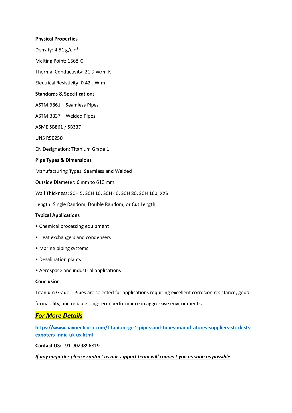 2. Physical Properties Density: 4.51 g/cm³ Melting Point: 1668°C Thermal Conductivity: 21.9 W/m·K Electrical Resistivity: 0.42 μW·m Standards & Specifications ASTM B861 – Seamless Pipes ASTM B337 – Welded Pipes ASME SB861 / SB337 UNS R50250 EN Designation: Titanium Grade 1 Pipe Types & Dimensions Manufacturing Types: Seamless and Welded Outside Diameter: 6 mm to 610 mm Wall Thickness: SCH 5, SCH 10, SCH 40, SCH 80, SCH 160, XXS Length: Single Random, Double Random, or Cut Length Typical Applications • Chemical processing equipment • Heat exchangers and condensers • Marine piping systems • Desalination plants • Aerospace and industrial applications Conclusion Titanium Grade 1 Pipes are selected for applications requiring excellent corrosion resistance, good formability, and reliable long-term performance in aggressive environments. For More Details https://www.navneetcorp.com/titanium-gr-1-pipes-and-tubes-manufratures-suppliers-stockists- expoters-india-uk-us.html Contact US: +91-9029896819 If any enquiries please contact us our support team will connect you as soon as possible