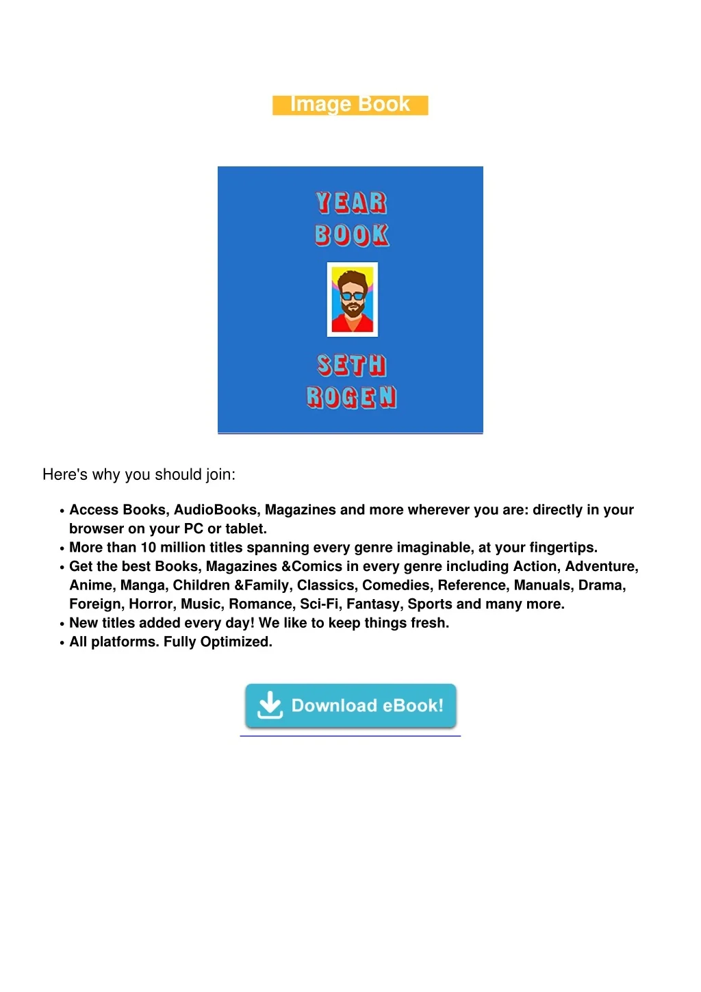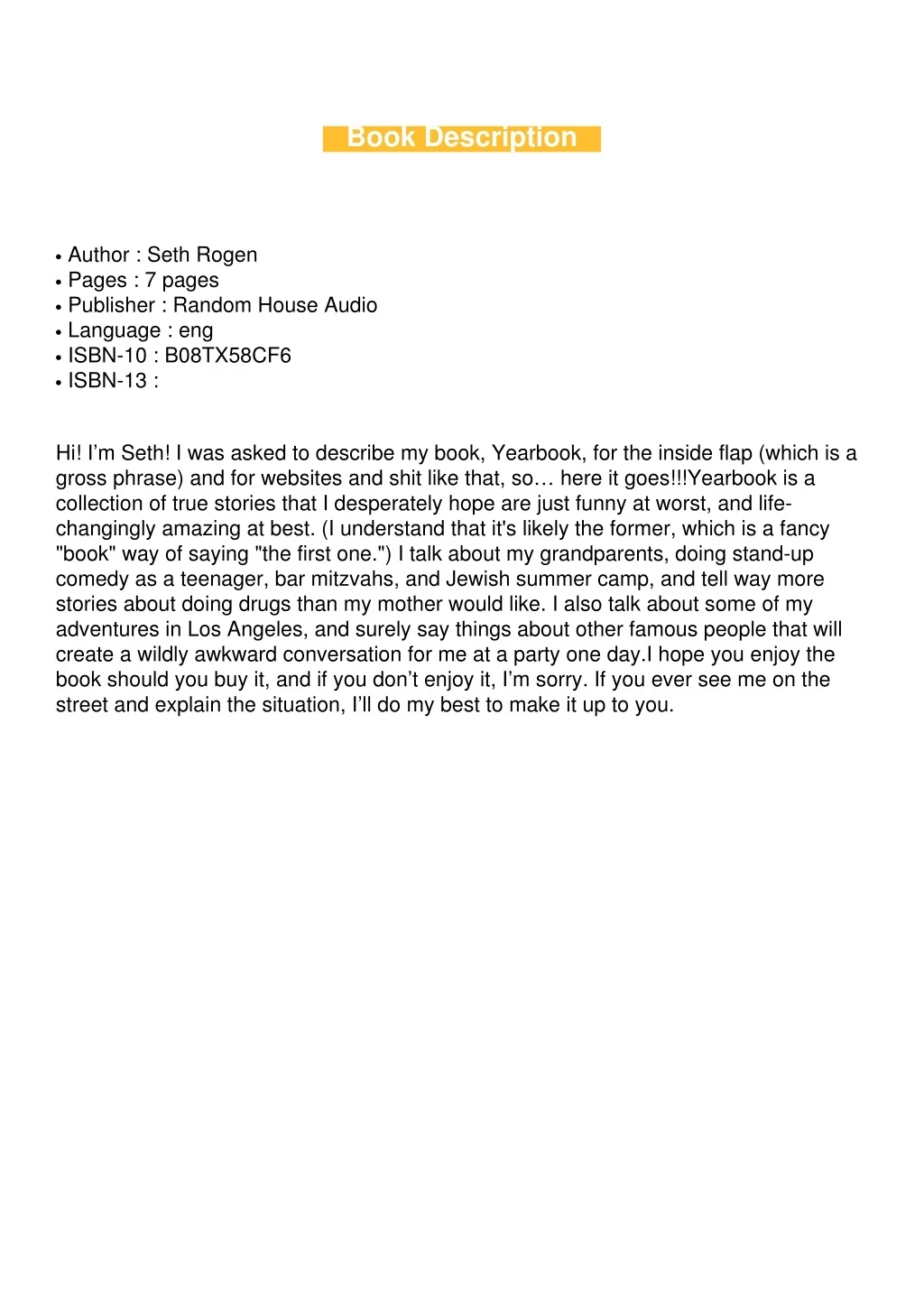 Book Description Author : Seth Rogen Pages : 7 pages Publisher : Random House Audio Language : eng ISBN-10 : B08TX58CF6 ISBN-13 : G G G G G G Hi! I’m Seth! I was asked to describe my book, Yearbook, for the inside flap (which is a gross phrase) and for websites and shit like that, so… here it goes!!!Yearbook is a collection of true stories that I desperately hope are just funny at worst, and life- changingly amazing at best. (I understand that it's likely the former, which is a fancy "book" way of saying "the first one.") I talk about my grandparents, doing stand-up comedy as a teenager, bar mitzvahs, and Jewish summer camp, and tell way more stories about doing drugs than my mother would like. I also talk about some of my adventures in Los Angeles, and surely say things about other famous people that will create a wildly awkward conversation for me at a party one day.I hope you enjoy the book should you buy it, and if you don’t enjoy it, I’m sorry. If you ever see me on the street and explain the situation, I’ll do my best to make it up to you.