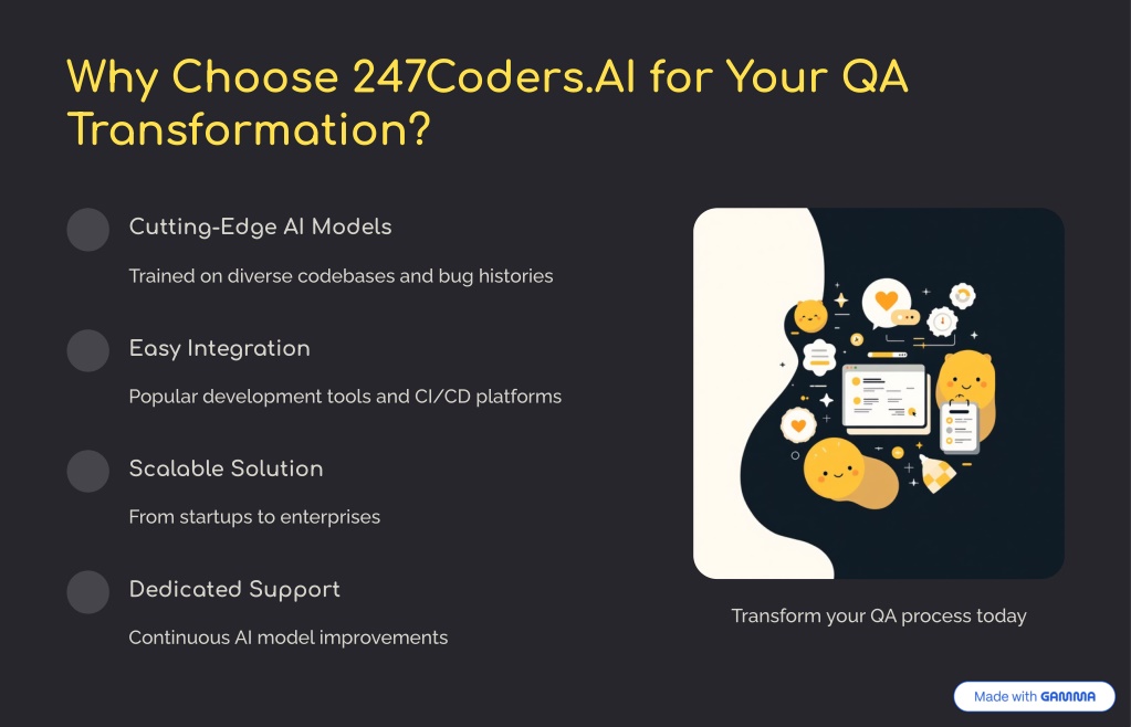 Say goodbye to endless bugs and delayed releases!<br>With 247Coders.AI, Quality Assurance is powered by AI-driven testingu2014helping you detect issues faster, reduce costs, and deliver flawless apps in record time.<br><br>u2705 50% faster bug detection<br>u2705 93% cost reduction in QA<br>u2705 Smarter, automated testing integrated into your CI/CD pipeline<br><br>Future-proof your development with intelligent QA solutions. ud83dudd25