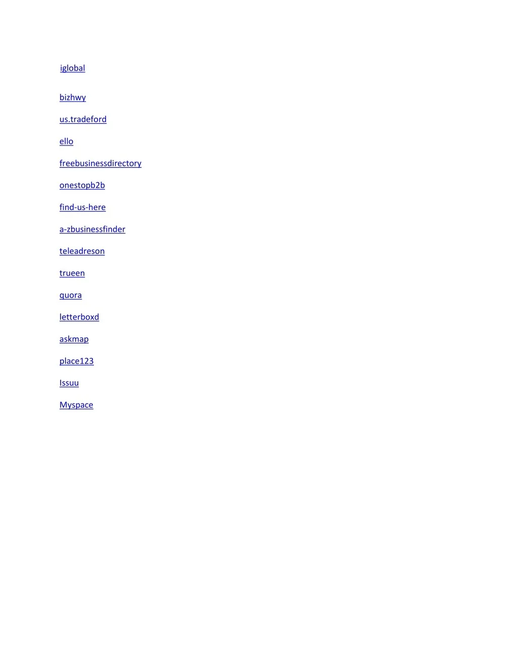 iglobal bizhwy us.tradeford ello freebusinessdirectory onestopb2b find-us-here a-zbusinessfinder teleadreson trueen quora letterboxd askmap place123 Issuu Myspace
