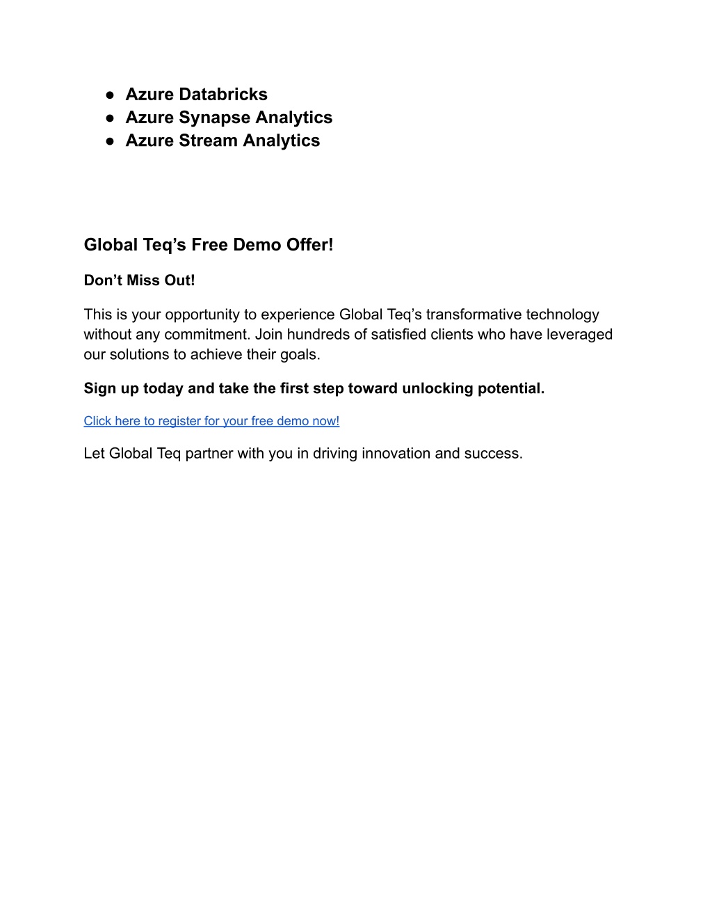 ● Azure Databricks ● Azure Synapse Analytics ● Azure Stream Analytics Global Teq’s Free Demo Offer! Don’t Miss Out! This is your opportunity to experience Global Teq’s transformative technology without any commitment. Join hundreds of satisfied clients who have leveraged our solutions to achieve their goals. Sign up today and take the first step toward unlocking potential. Click here to register for your free demo now! Let Global Teq partner with you in driving innovation and success.