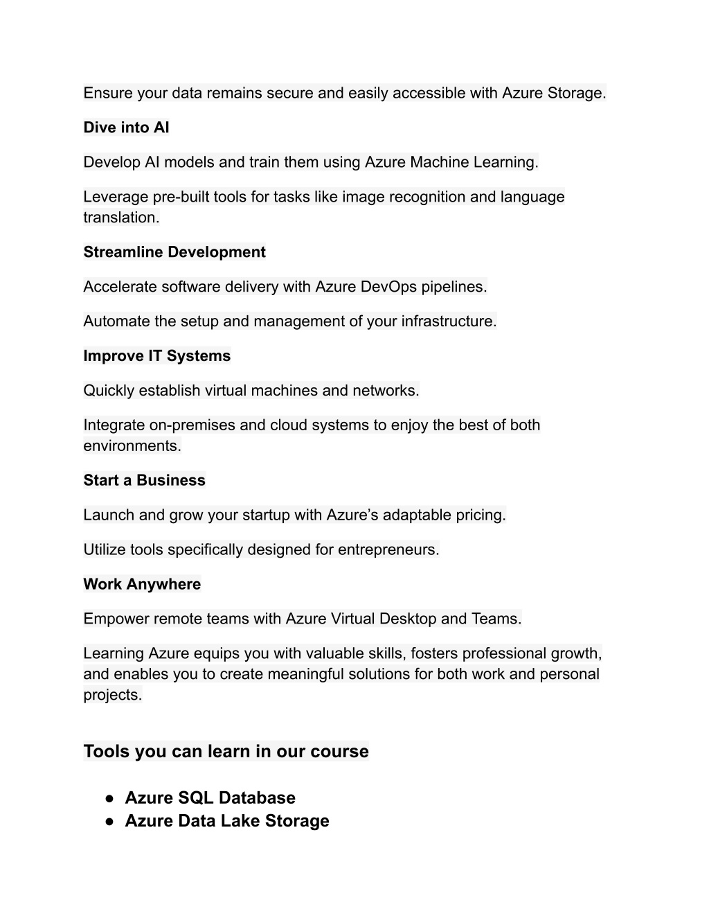 Ensure your data remains secure and easily accessible with Azure Storage. Dive into AI Develop AI models and train them using Azure Machine Learning. Leverage pre-built tools for tasks like image recognition and language translation. Streamline Development Accelerate software delivery with Azure DevOps pipelines. Automate the setup and management of your infrastructure. Improve IT Systems Quickly establish virtual machines and networks. Integrate on-premises and cloud systems to enjoy the best of both environments. Start a Business Launch and grow your startup with Azure’s adaptable pricing. Utilize tools specifically designed for entrepreneurs. Work Anywhere Empower remote teams with Azure Virtual Desktop and Teams. Learning Azure equips you with valuable skills, fosters professional growth, and enables you to create meaningful solutions for both work and personal projects. Tools you can learn in our course ● Azure SQL Database ● Azure Data Lake Storage