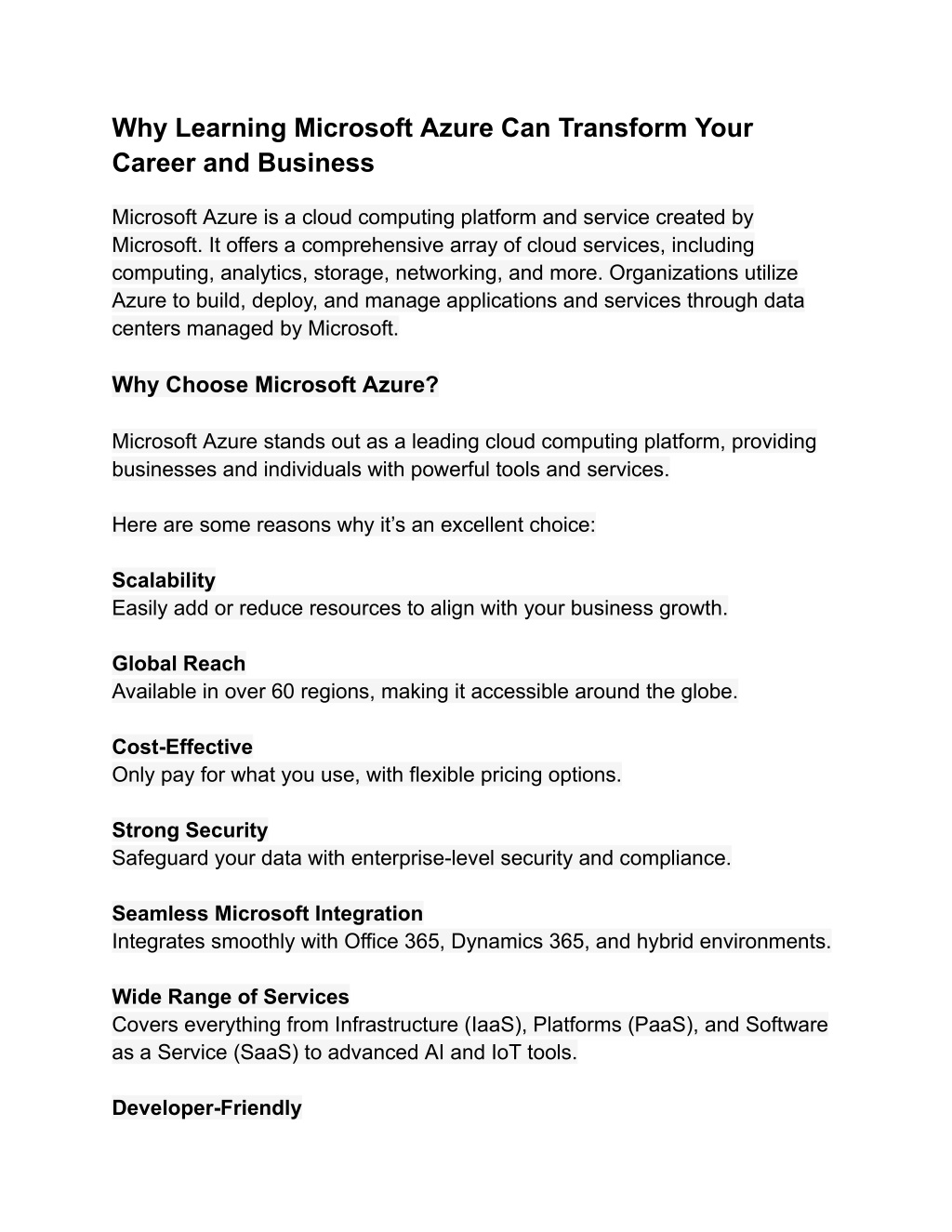 Why Learning Microsoft Azure Can Transform Your Career and Business Microsoft Azure is a cloud computing platform and service created by Microsoft. It offers a comprehensive array of cloud services, including computing, analytics, storage, networking, and more. Organizations utilize Azure to build, deploy, and manage applications and services through data centers managed by Microsoft. Why Choose Microsoft Azure? Microsoft Azure stands out as a leading cloud computing platform, providing businesses and individuals with powerful tools and services. Here are some reasons why it’s an excellent choice: Scalability Easily add or reduce resources to align with your business growth. Global Reach Available in over 60 regions, making it accessible around the globe. Cost-Effective Only pay for what you use, with flexible pricing options. Strong Security Safeguard your data with enterprise-level security and compliance. Seamless Microsoft Integration Integrates smoothly with Office 365, Dynamics 365, and hybrid environments. Wide Range of Services Covers everything from Infrastructure (IaaS), Platforms (PaaS), and Software as a Service (SaaS) to advanced AI and IoT tools. Developer-Friendly