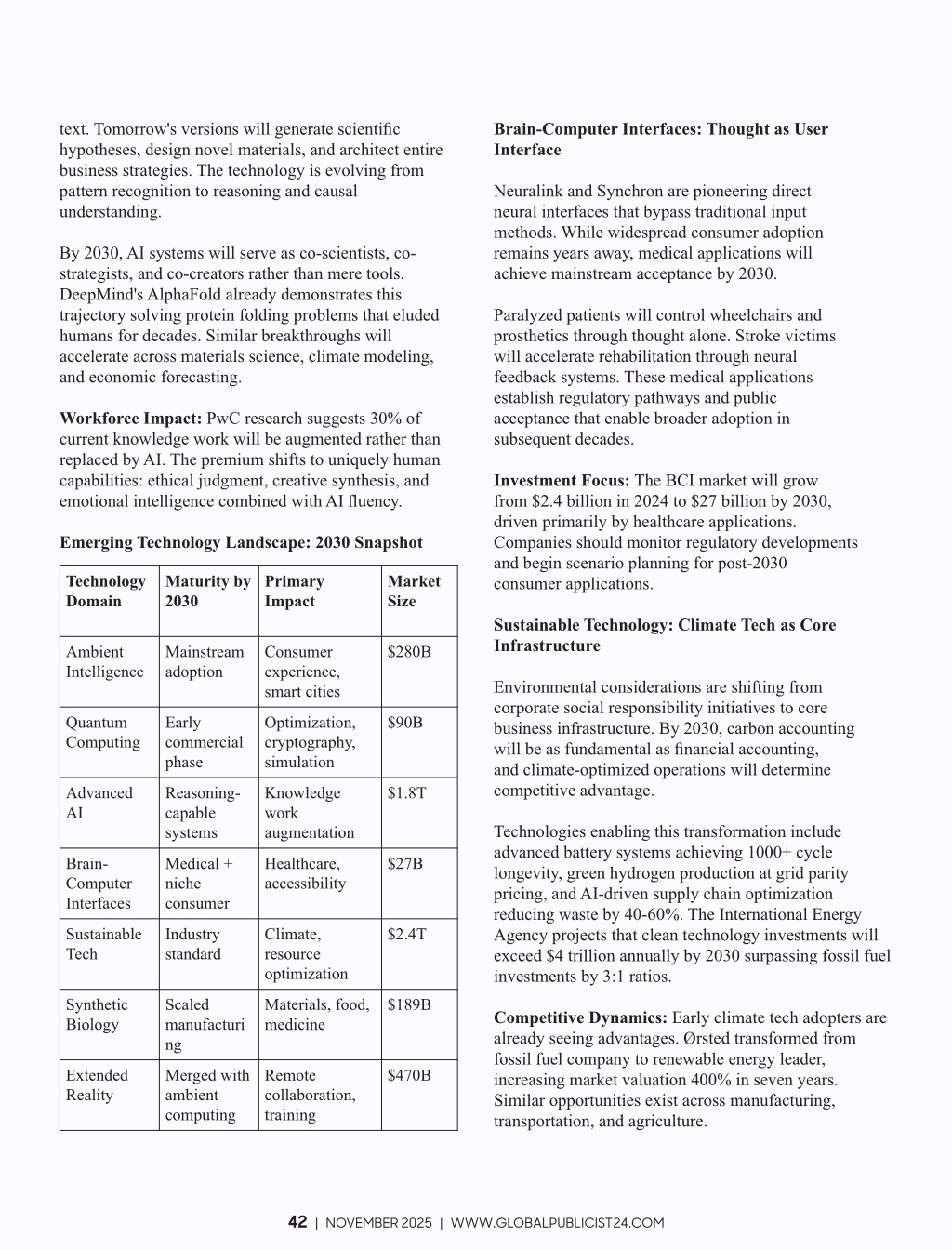 Brain-Computer Interfaces: Thought as User Interface text. Tomorrow's versions will generate scientific hypotheses, design novel materials, and architect entire business strategies. The technology is evolving from pattern recognition to reasoning and causal understanding. Neuralink and Synchron are pioneering direct neural interfaces that bypass traditional input methods. While widespread consumer adoption remains years away, medical applications will achieve mainstream acceptance by 2030. By 2030, AI systems will serve as co-scientists, co- strategists, and co-creators rather than mere tools. DeepMind's AlphaFold already demonstrates this trajectory solving protein folding problems that eluded humans for decades. Similar breakthroughs will accelerate across materials science, climate modeling, and economic forecasting. Paralyzed patients will control wheelchairs and prosthetics through thought alone. Stroke victims will accelerate rehabilitation through neural feedback systems. These medical applications establish regulatory pathways and public acceptance that enable broader adoption in subsequent decades. Workforce Impact: PwC research suggests 30% of current knowledge work will be augmented rather than replaced by AI. The premium shifts to uniquely human capabilities: ethical judgment, creative synthesis, and emotional intelligence combined with AI fluency. Investment Focus: The BCI market will grow from $2.4 billion in 2024 to $27 billion by 2030, driven primarily by healthcare applications. Companies should monitor regulatory developments and begin scenario planning for post-2030 consumer applications. Emerging Technology Landscape: 2030 Snapshot Technology Domain Maturity by 2030 Primary Impact Market Size Sustainable Technology: Climate Tech as Core Infrastructure Ambient Intelligence Mainstream adoption Consumer experience, smart cities $280B Environmental considerations are shifting from corporate social responsibility initiatives to core business infrastructure. By 2030, carbon accounting will be as fundamental as financial accounting, and climate-optimized operations will determine competitive advantage. Quantum Computing Early commercial phase Optimization, cryptography, simulation $90B Advanced AI Reasoning- capable systems Knowledge work augmentation $1.8T Technologies enabling this transformation include advanced battery systems achieving 1000+ cycle longevity, green hydrogen production at grid parity pricing, and AI-driven supply chain optimization reducing waste by 40-60%. The International Energy Agency projects that clean technology investments will exceed $4 trillion annually by 2030 surpassing fossil fuel investments by 3:1 ratios. Brain- Computer Interfaces Medical + niche consumer Healthcare, accessibility $27B Sustainable Tech Industry standard Climate, resource optimization $2.4T Synthetic Biology Scaled manufacturi ng Materials, food, medicine $189B Competitive Dynamics: Early climate tech adopters are already seeing advantages. Ørsted transformed from fossil fuel company to renewable energy leader, increasing market valuation 400% in seven years. Similar opportunities exist across manufacturing, transportation, and agriculture. Extended Reality Merged with ambient computing Remote collaboration, training $470B 42 | NOVEMBER 2025 | WWW.GLOBALPUBLICIST24.COM